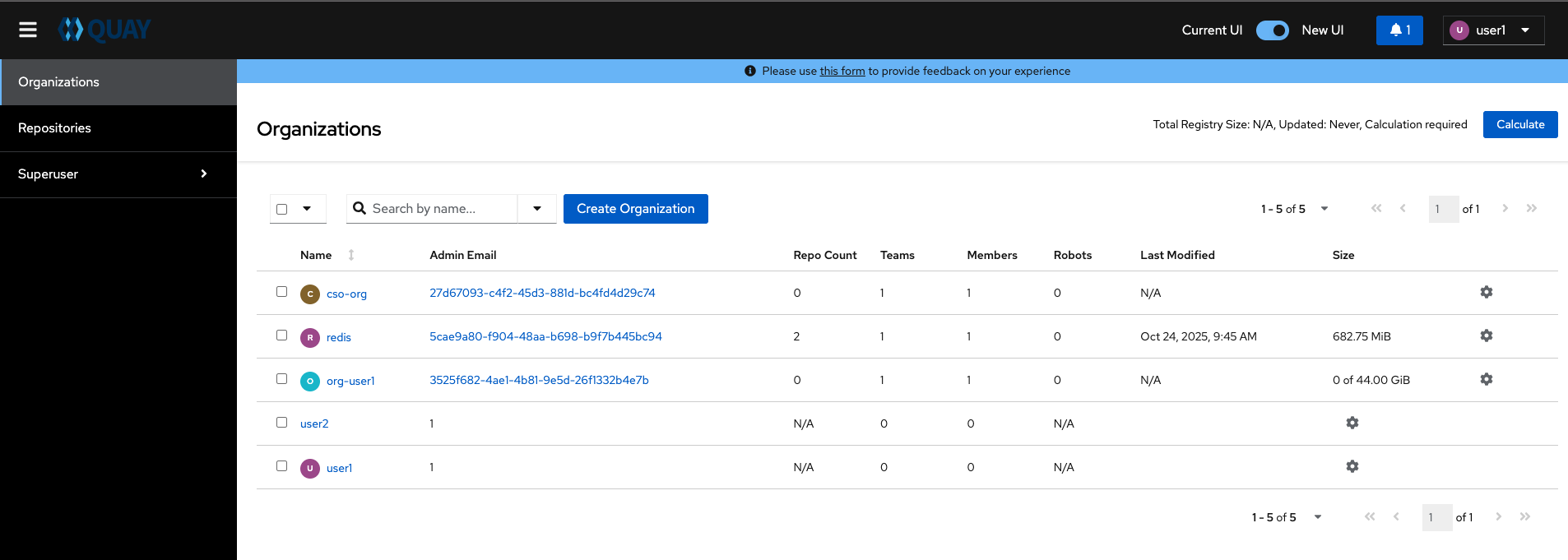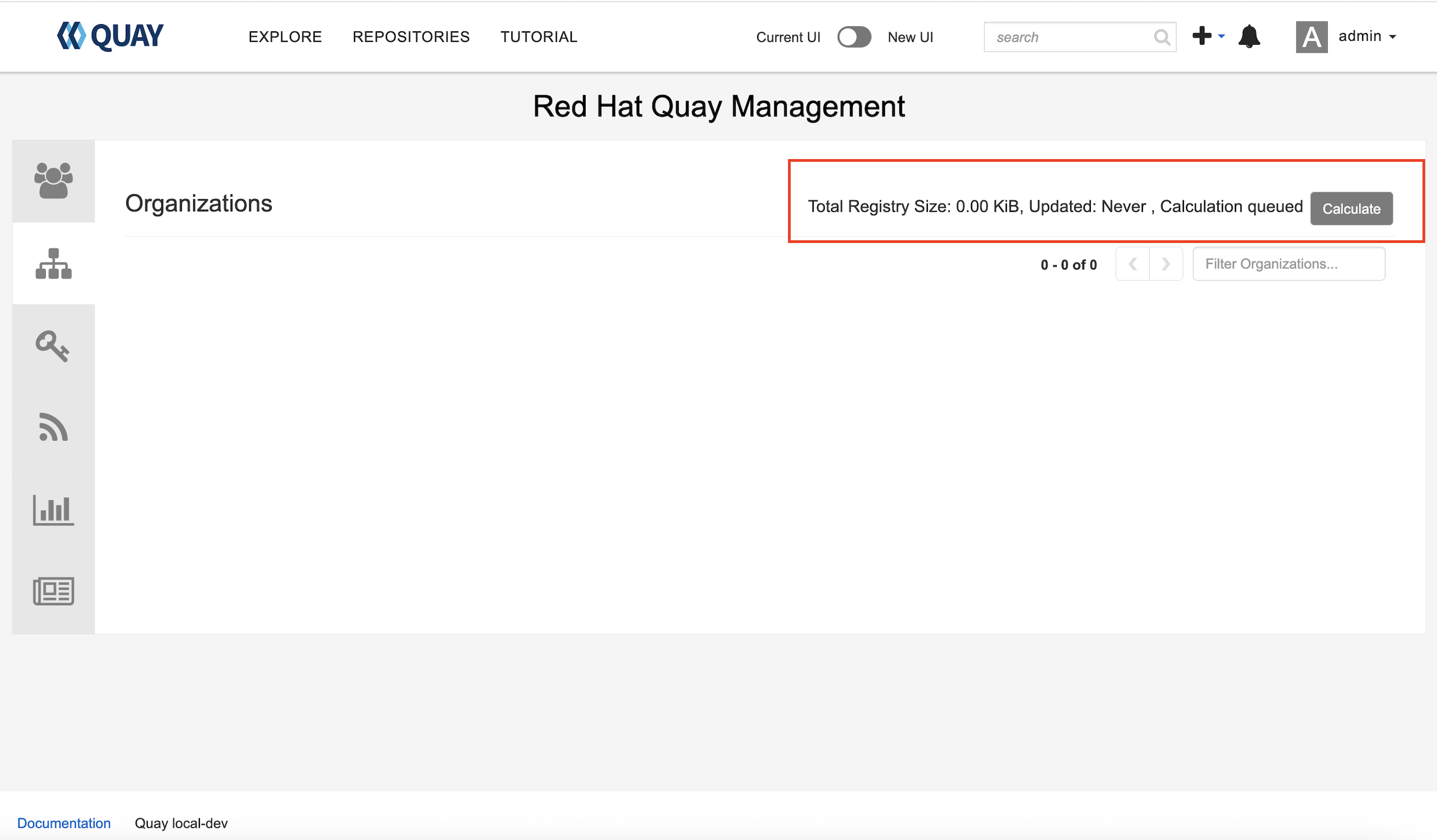 This is an issue found in Quay 3.16.0 new UI, after enabled Quay Quota Management, on current UI Quay Super user can click button "Calculate" to get the "Total Registry Size", but Quay new UI doesn't provide the same functionality, pls review this new UI issue.