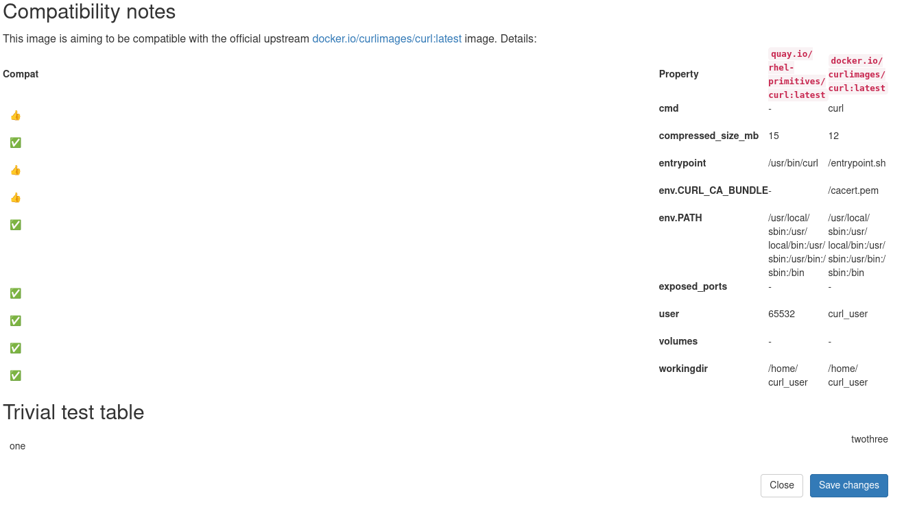I am trying to push the upstream README.md from our project to its quay page at https://quay.io/repository/rhel-primitives/curl . That README contains a Markdown table with footnotes. Apparently quay.io's Markdown renderer does not understand either, and makes a mess out of it (table is rendered as a single line as raw markdown, and the footnotes as a second single raw line below).