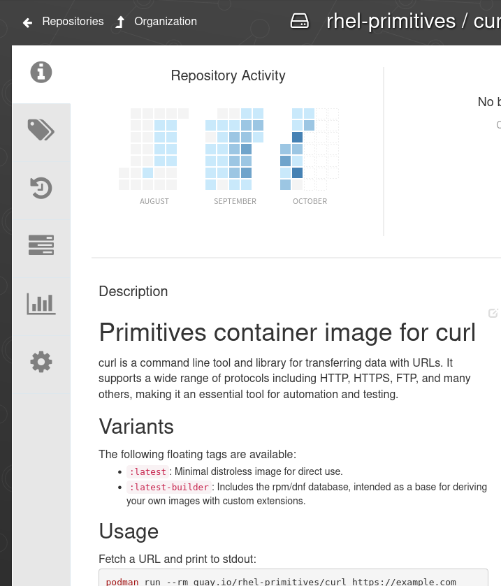 https://quay.io/repository/rhel-primitives/curl in the stable UI shows an image's description by default, which is good – knowing what an image is for, and how to use it (documentation) is vital. It's not working great (PROJQUAY-9555), but workable.
