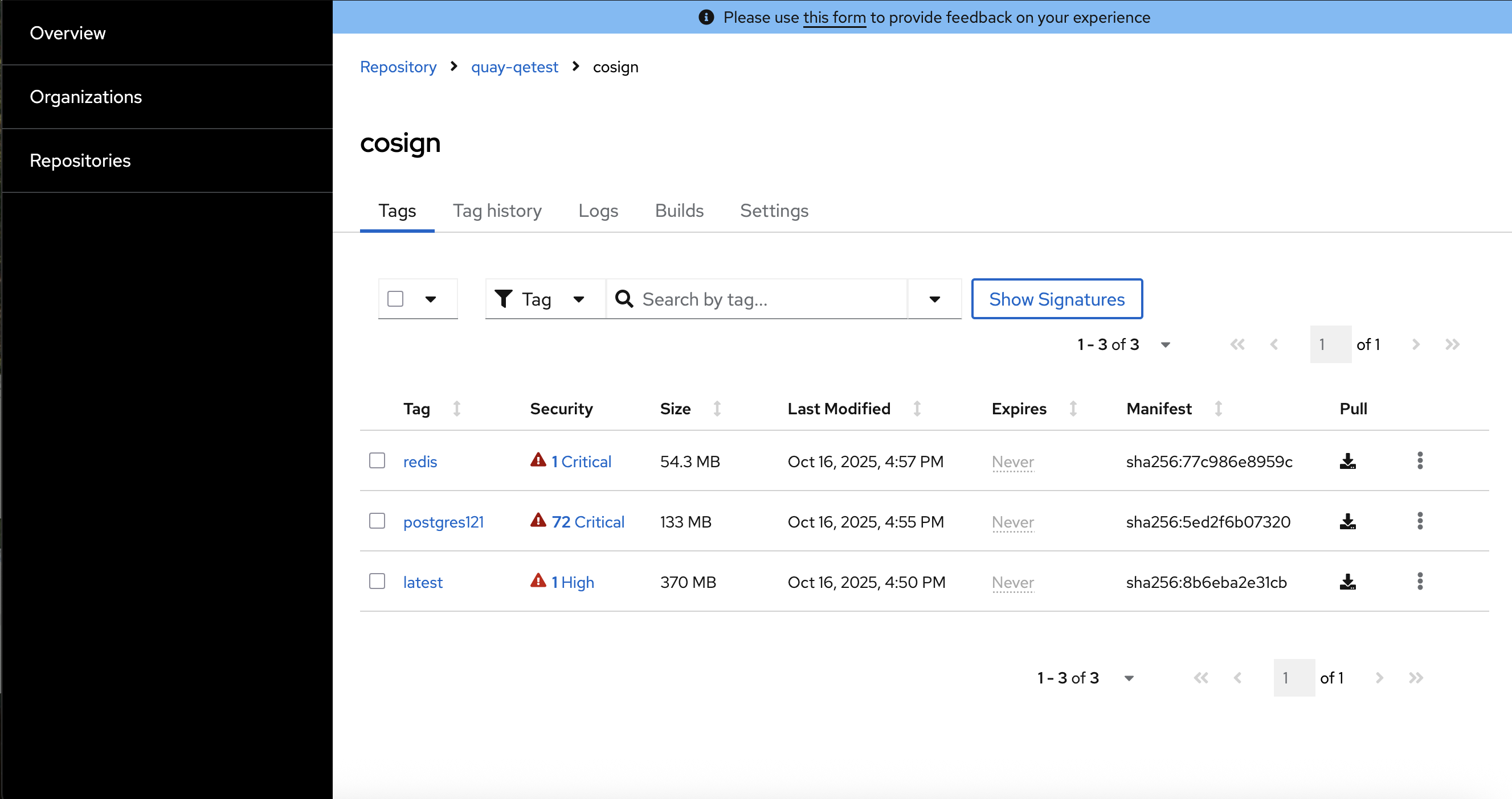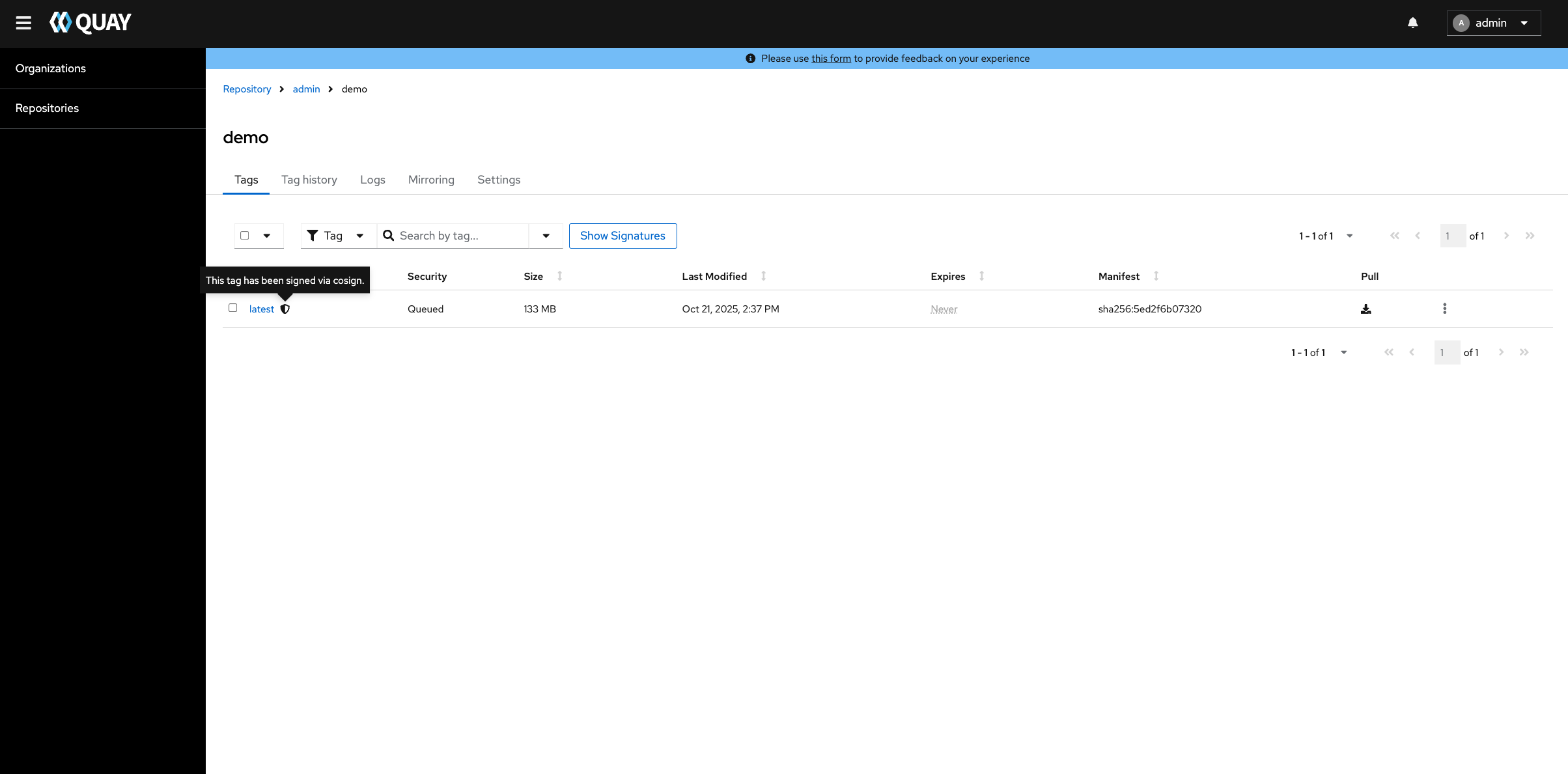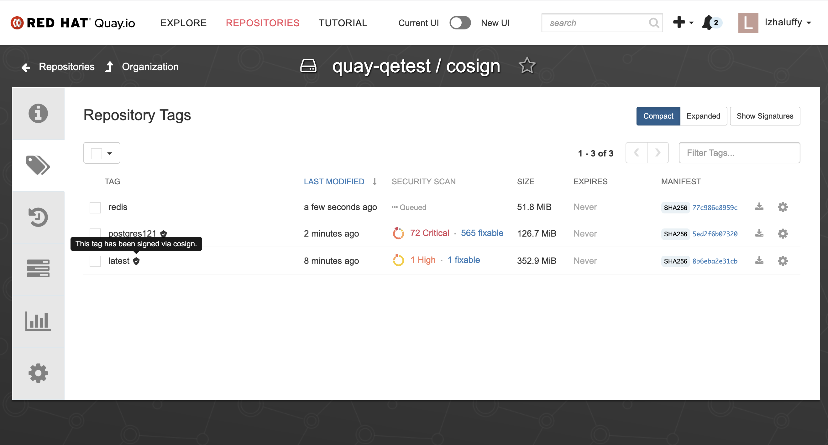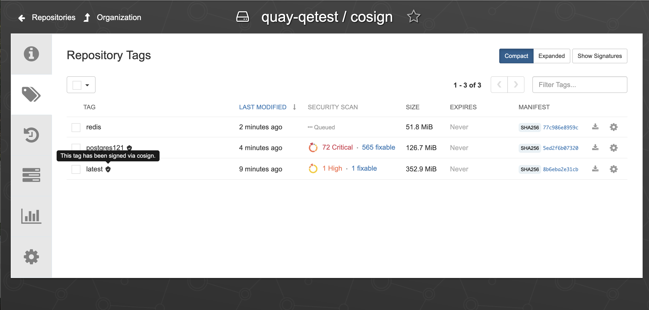 This is an issue found in Quay new UI image tags management, when an image is Signed by Cosign, Quay Current UI will display an Icon and indicate "This Tag has been signed via Cosign", but on newUI can't see the same behavior, this is gap of new UI, pls review this issue.