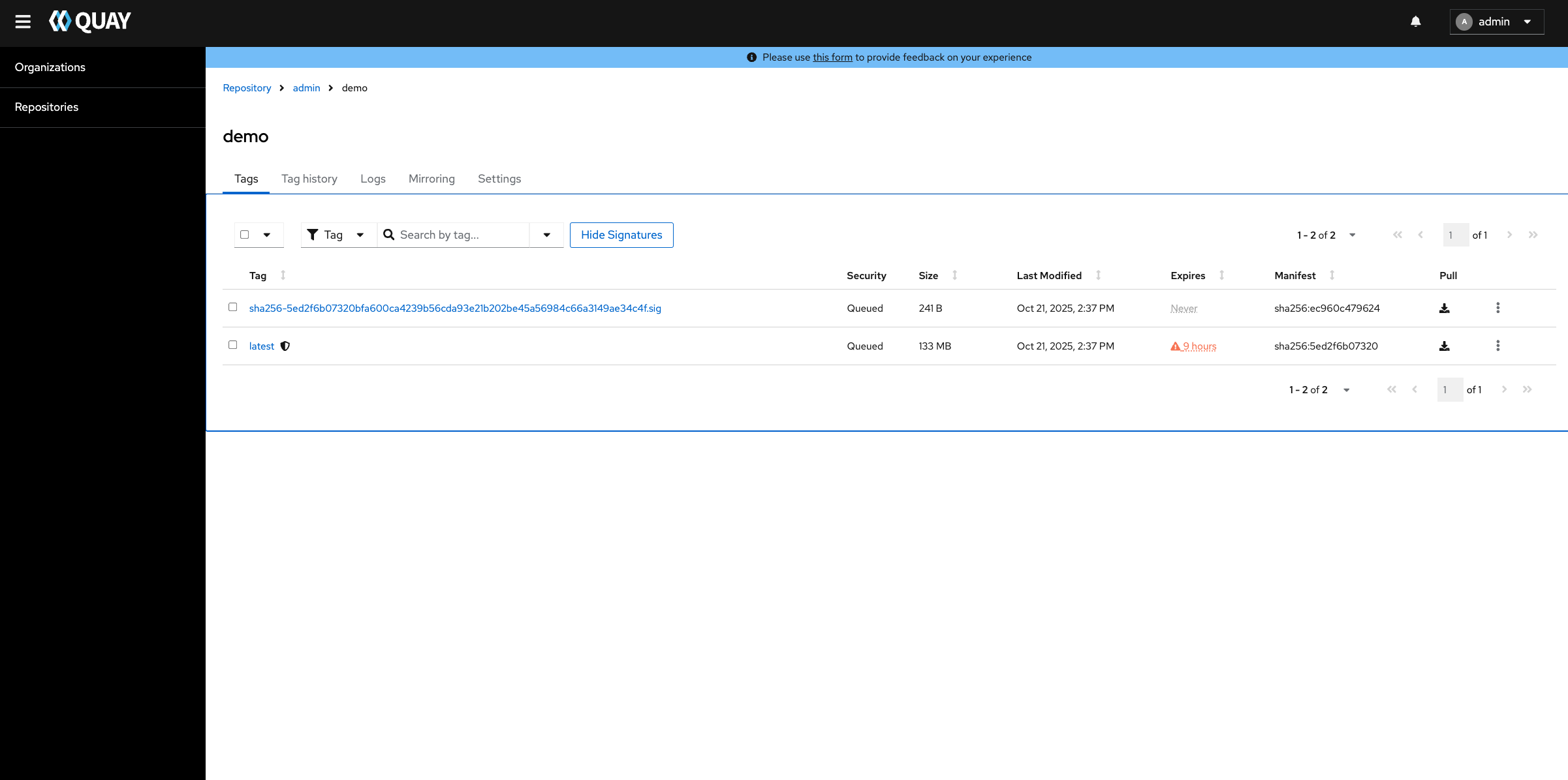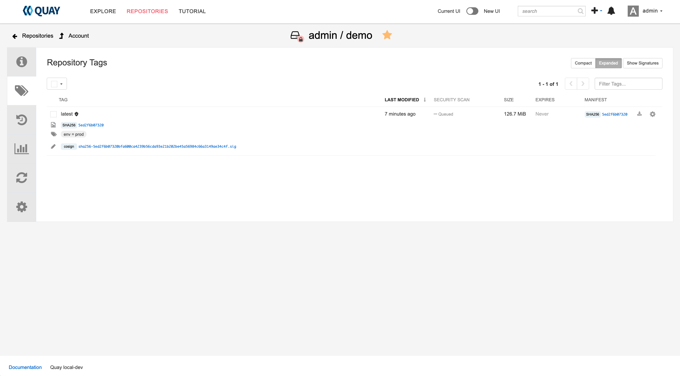 This is an issue found in Quay new UI image tags page, in current UI it support Compact/Expanded Views, when Quay Users want to see more details of the specified image tag, can use "Expanded" view, but this is not supported on Quay new UI, so this should be considered as a gap when make default UI to new UI, pls review this new UI issue.