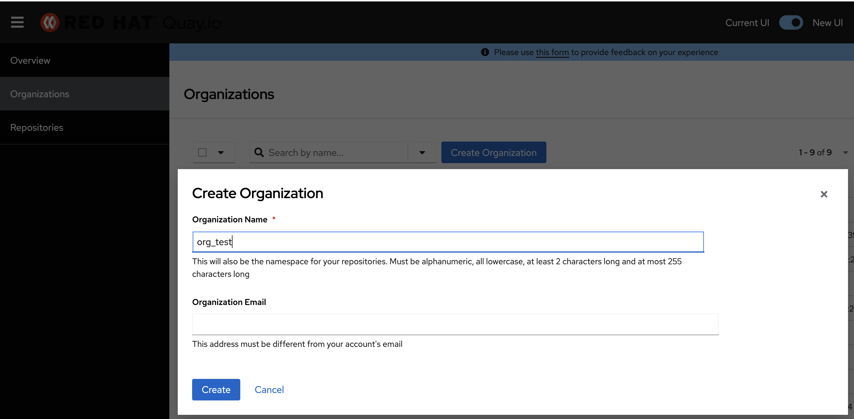 [stage.quay.io]There is no alert to fill in the email address when creating an organization in new UI