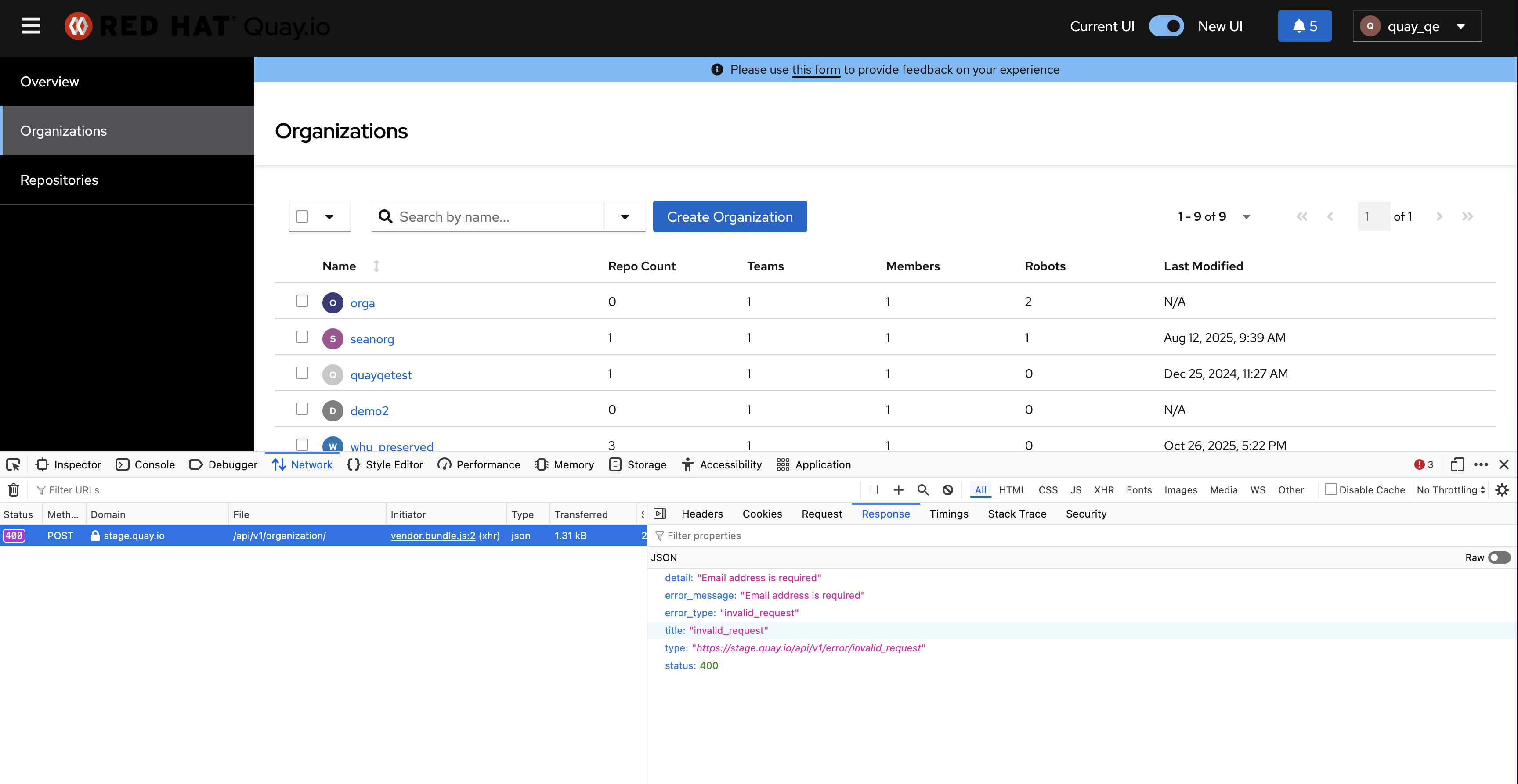 [stage.quay.io]There is no alert to fill in the email address when creating an organization in new UI