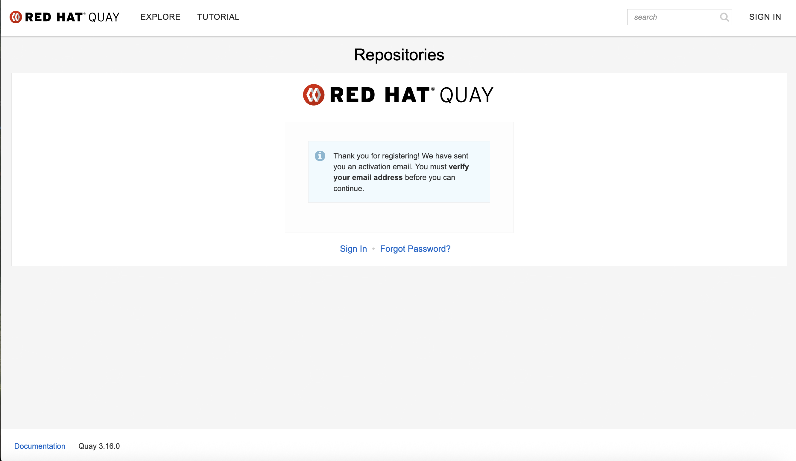 This is an issue found in Quay 3.16.0 new UI login page, when Quay is configured with Email settings, found at the step of creating new account, there's no page to ask Quay users to verify the mail address, compare with current UI, Quay will ask users to verify the mail address, pls review this new UI login issue.