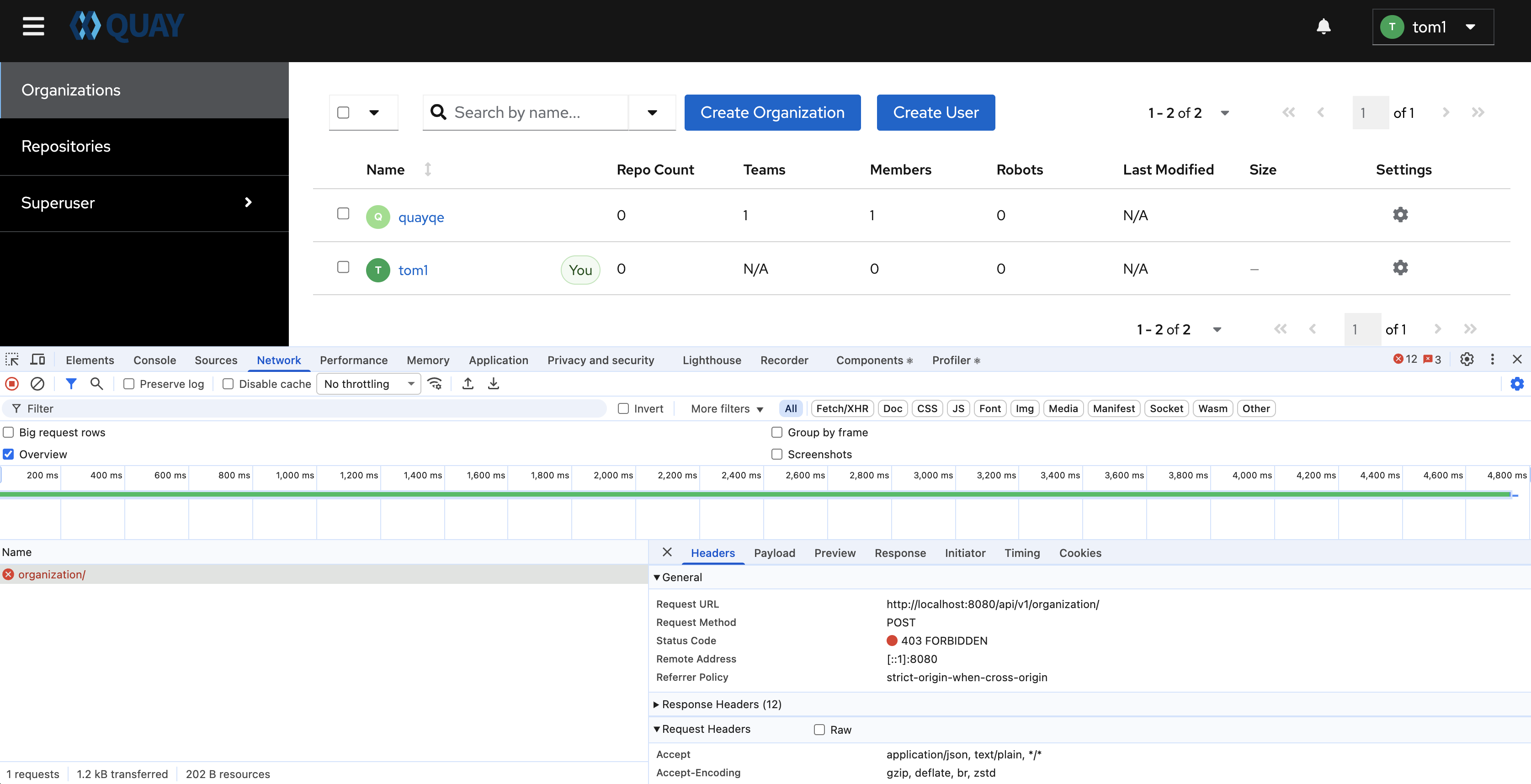 gunicorn-web stdout | 2025-11-05 06:48:45,495 [258] [DEBUG] [app] Starting request: urn:request:735079e0-6d80-4c07-8c9a-e2fa4d3378d9 (/api/v1/organization/) {'X-Forwarded-For': 'y.y.y.1, x.x.x.2'} ... gunicorn-web stdout | 2025-11-05 06:48:45,517 [258] [DEBUG] [auth.permissions] Identity loaded: <QuayDeferredPermissionUser id="f35b563d-9bb2-4d3d-919f-158e2d10ed02" auth_type="user_uuid" provides=set()> gunicorn-web stdout | 2025-11-05 06:48:45,517 [258] [DEBUG] [auth.permissions] Deferring permissions for user with uuid: f35b563d-9bb2-4d3d-919f-158e2d10ed02 ...
