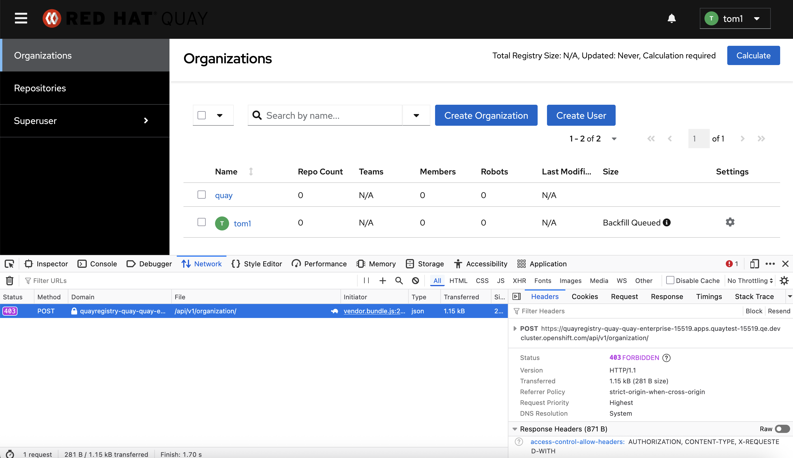 gunicorn-web stdout | 2025-11-05 06:48:45,955 [258] [DEBUG] [app] Ending request: urn:request:735079e0-6d80-4c07-8c9a-e2fa4d3378d9 (/api/v1/organization/) {'endpoint': 'api.organizationlist', 'request_id': 'urn:request:735079e0-6d80-4c07-8c9a-e2fa4d3378d9', 'remote_addr': 'x.x.x.2', 'http_method': 'POST', 'original_url': 'https://registry.apps.lab.acp.domain.redacted/api/v1/organization/', 'path': '/api/v1/organization/', 'parameters': {}, 'json_body': {'name': 'new_org'}, 'confsha': 'b3cb3175', 'user-agent': 'Mozilla/5.0 (Windows NT 10.0; Win64; x64) AppleWebKit/537.36 (KHTML, like Gecko) Chrome/142.0.0.0 Safari/537.36 Edg/142.0.0.0'}