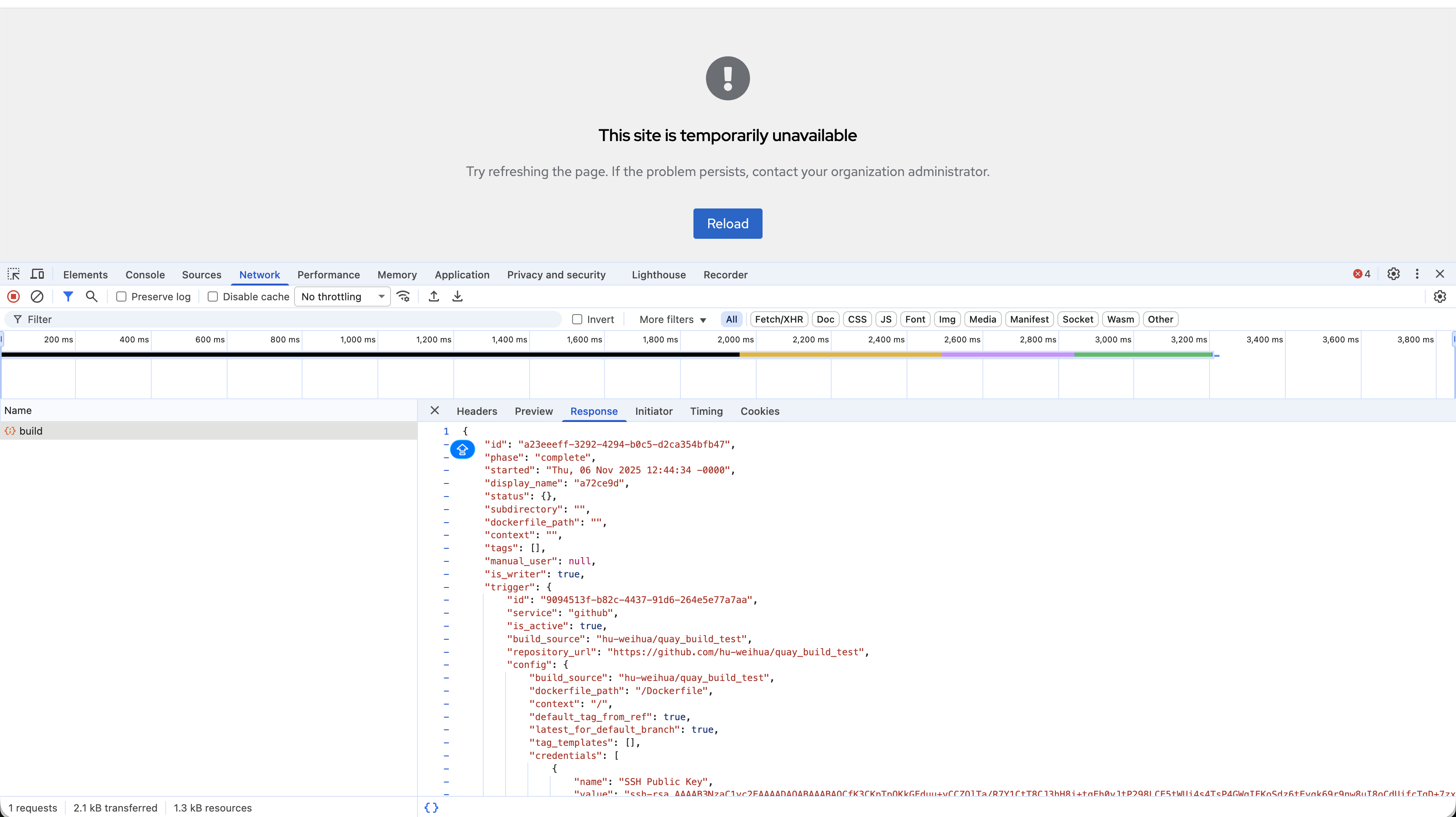 In quay 3.16.0 new UI.  when super user try to get one build log by build ID in super user panel,  the web page will go to  a unexpected page which show "This site is temporarily unavailable"