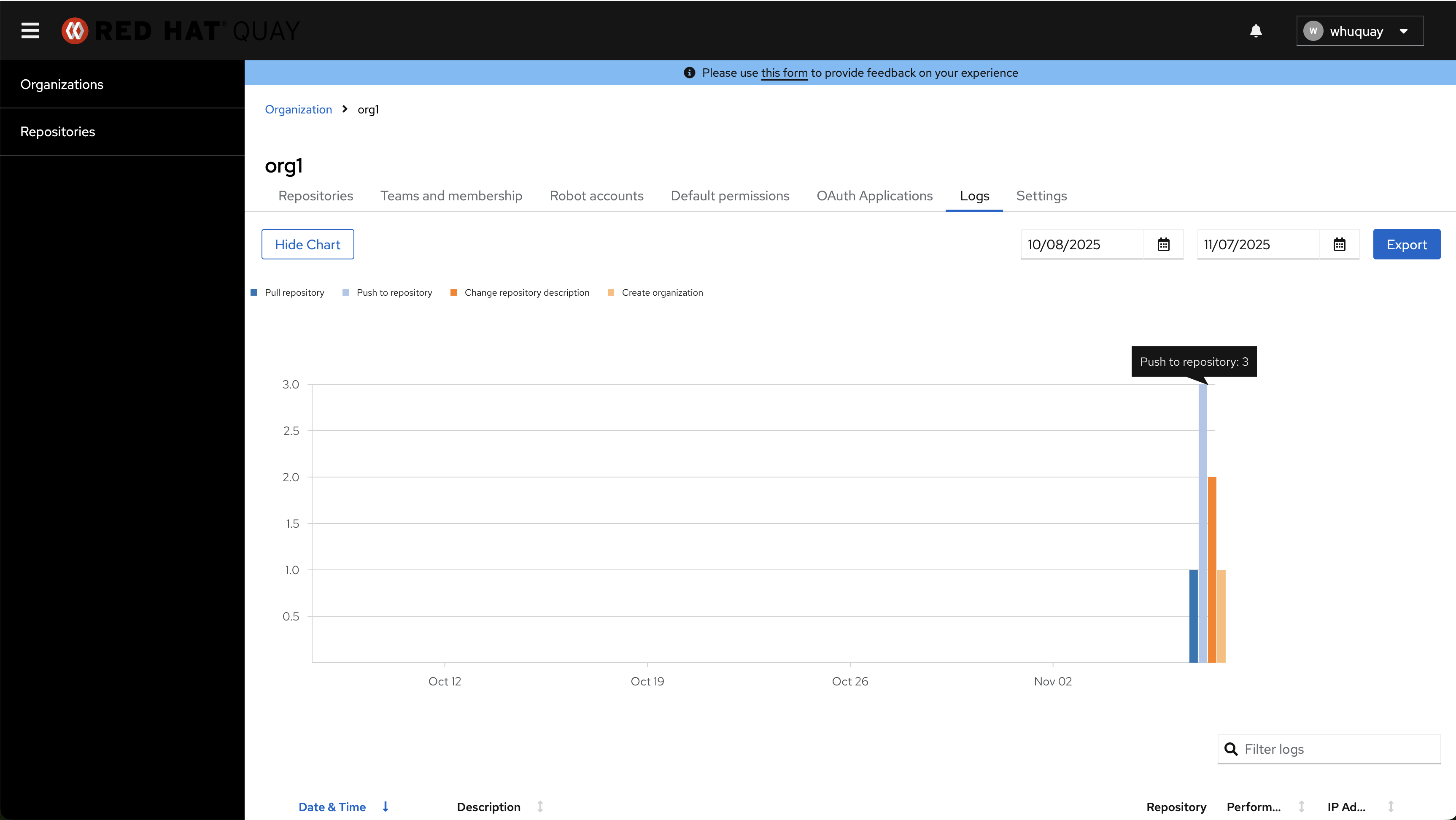 The organization logs bar chart has the same issue.