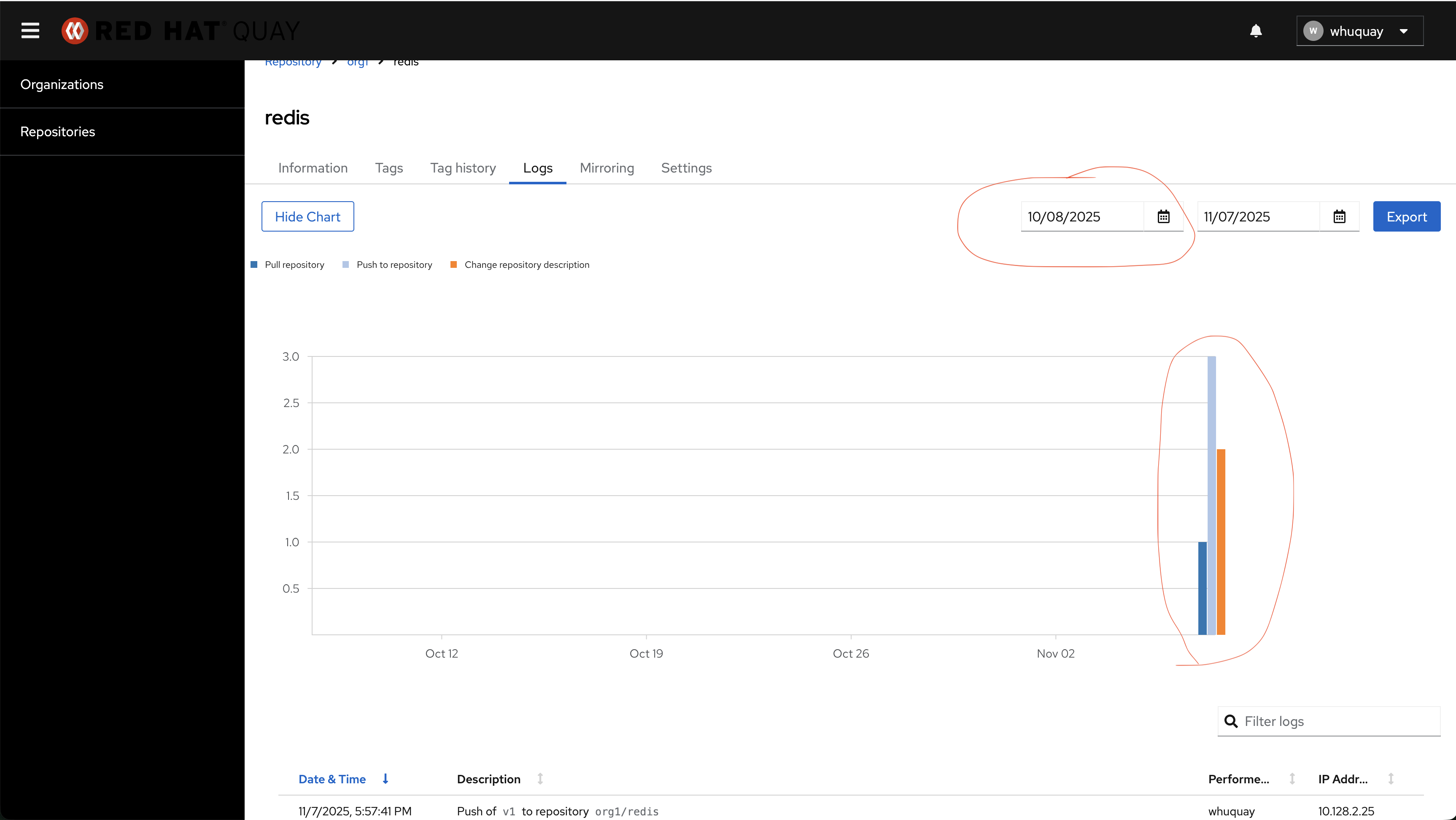 3. Go to repository Logs panel and check log bar chart