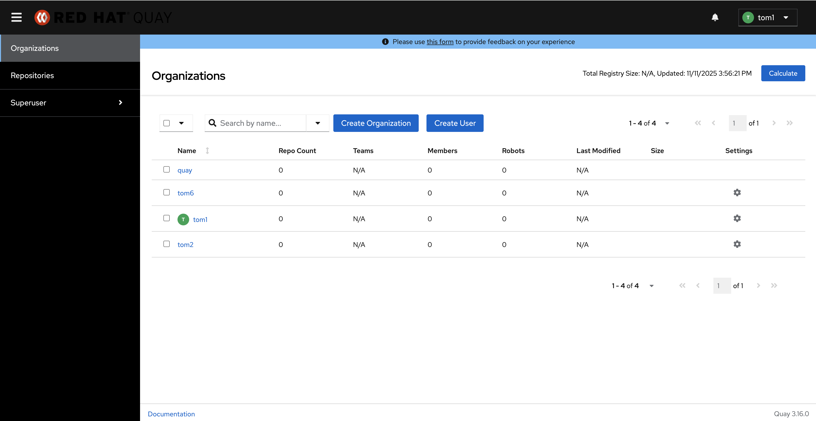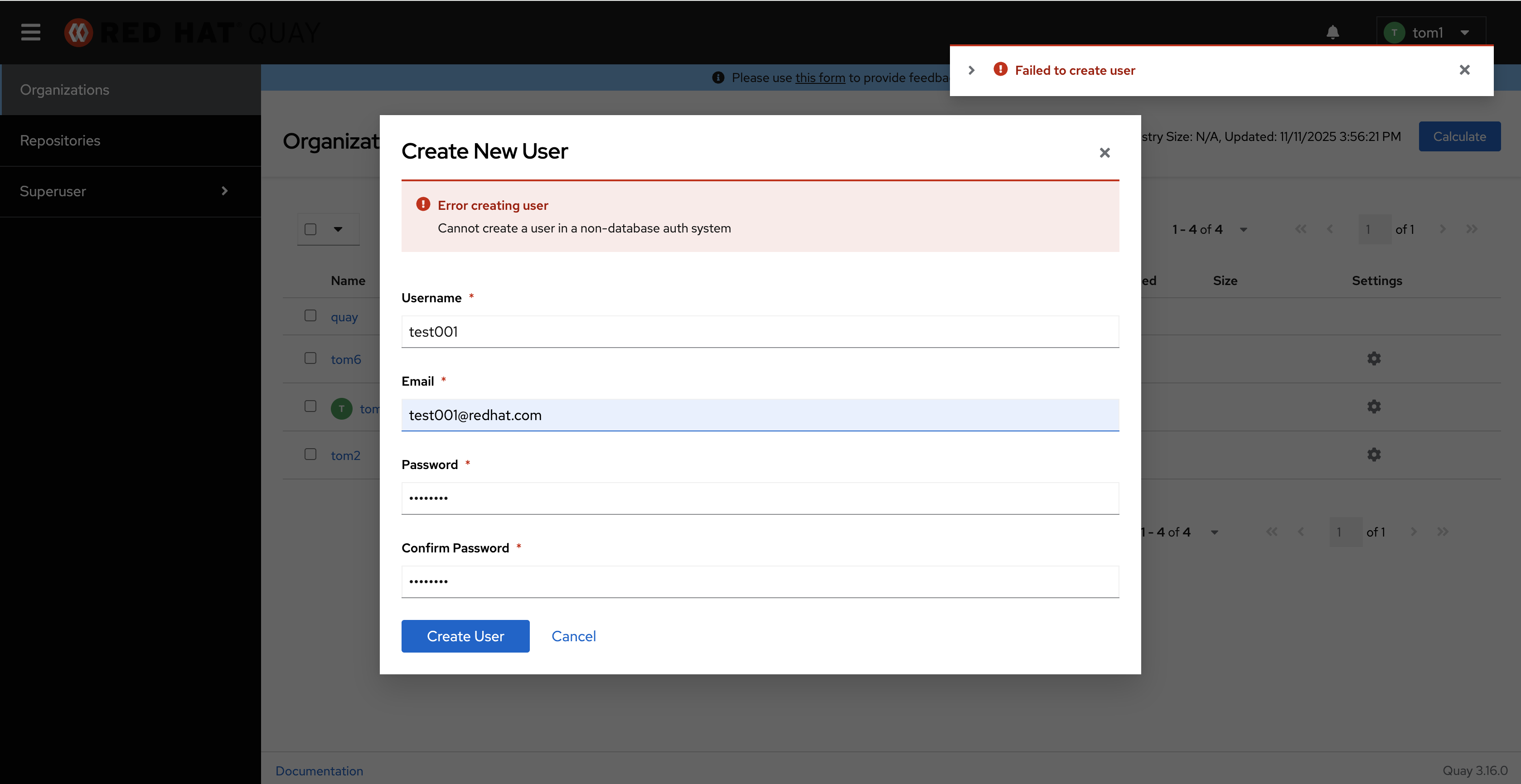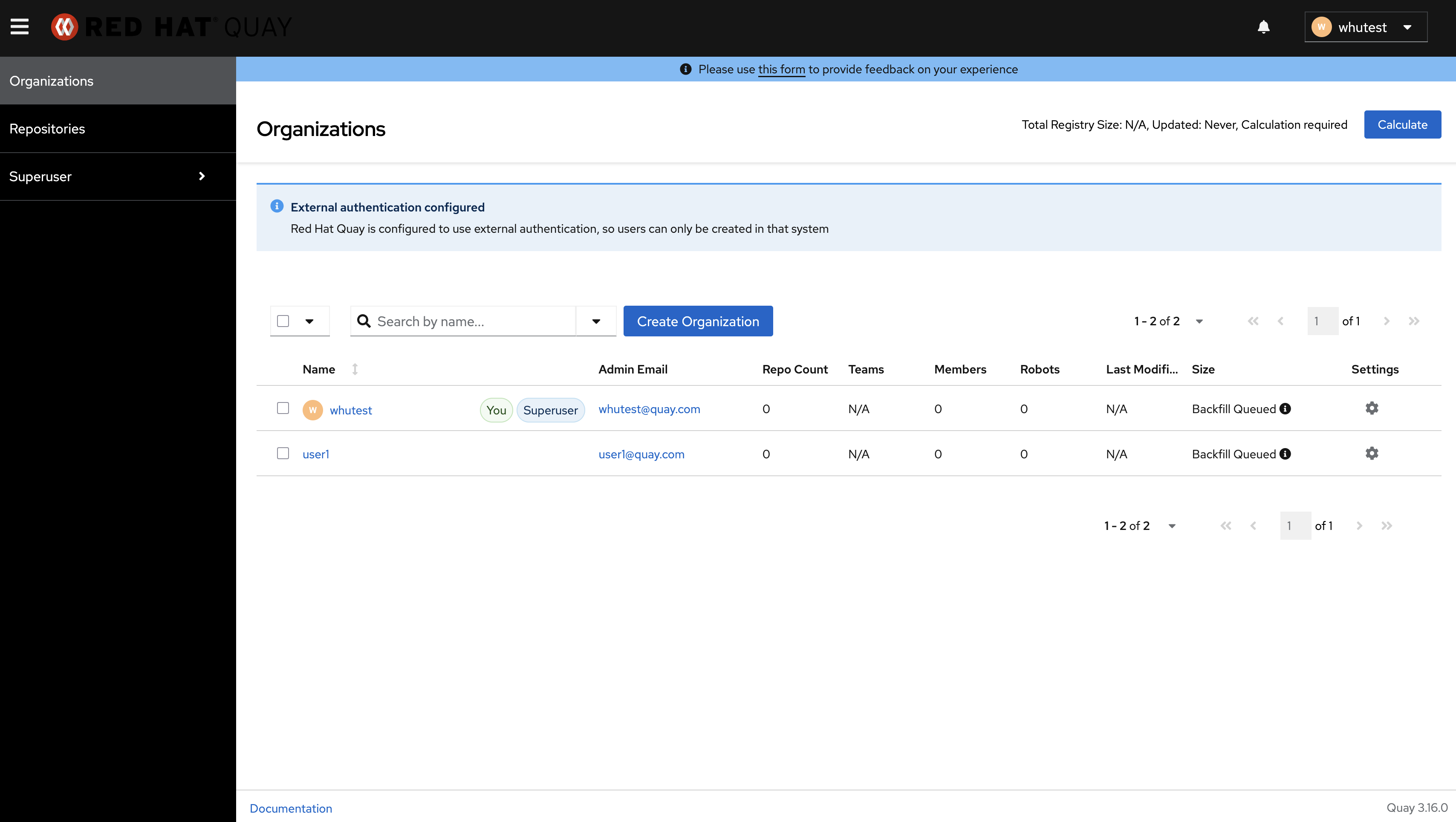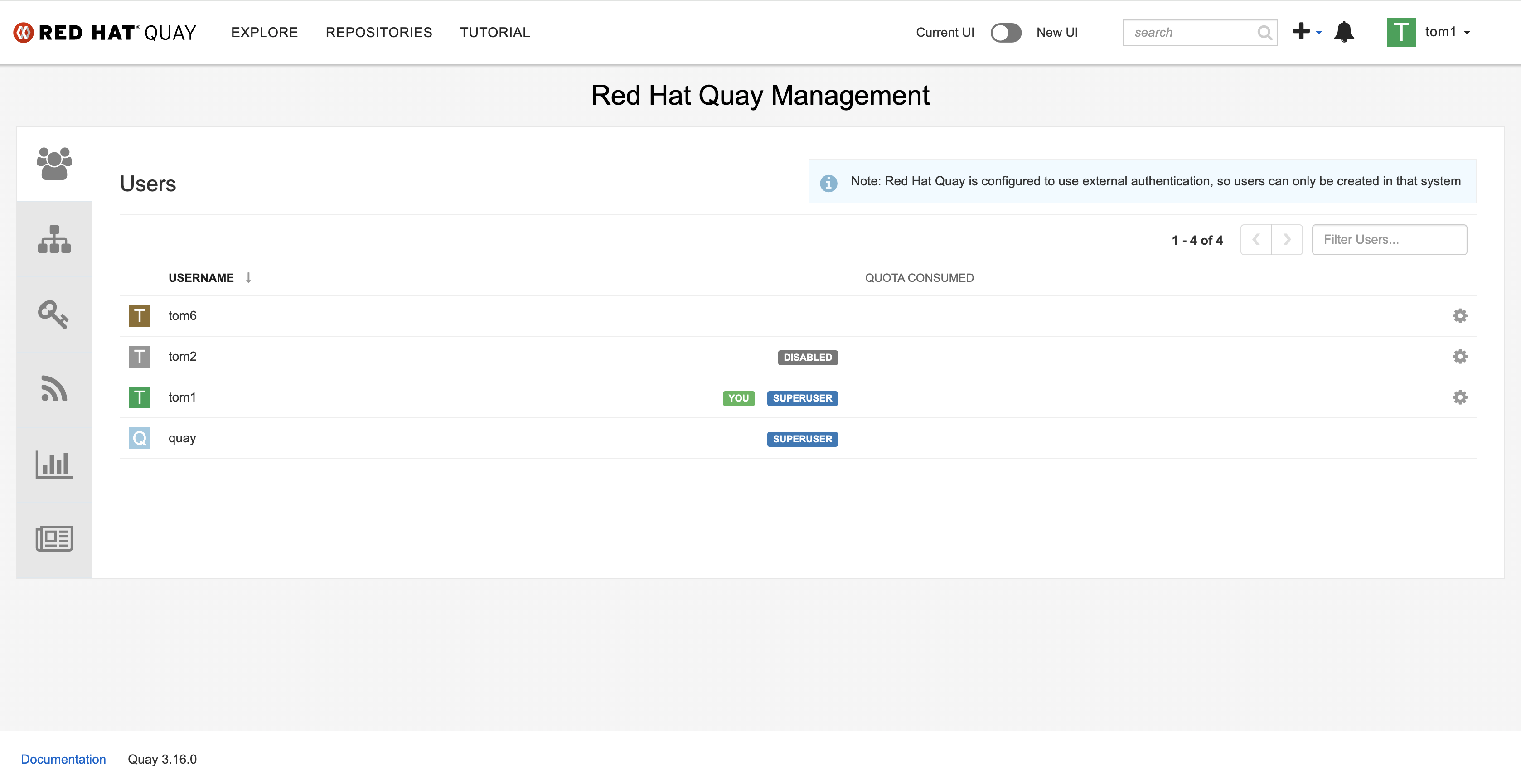 Note: Red Hat Quay is configured to use external authentication, so users can only be created in that system", pls review this new UI issue.