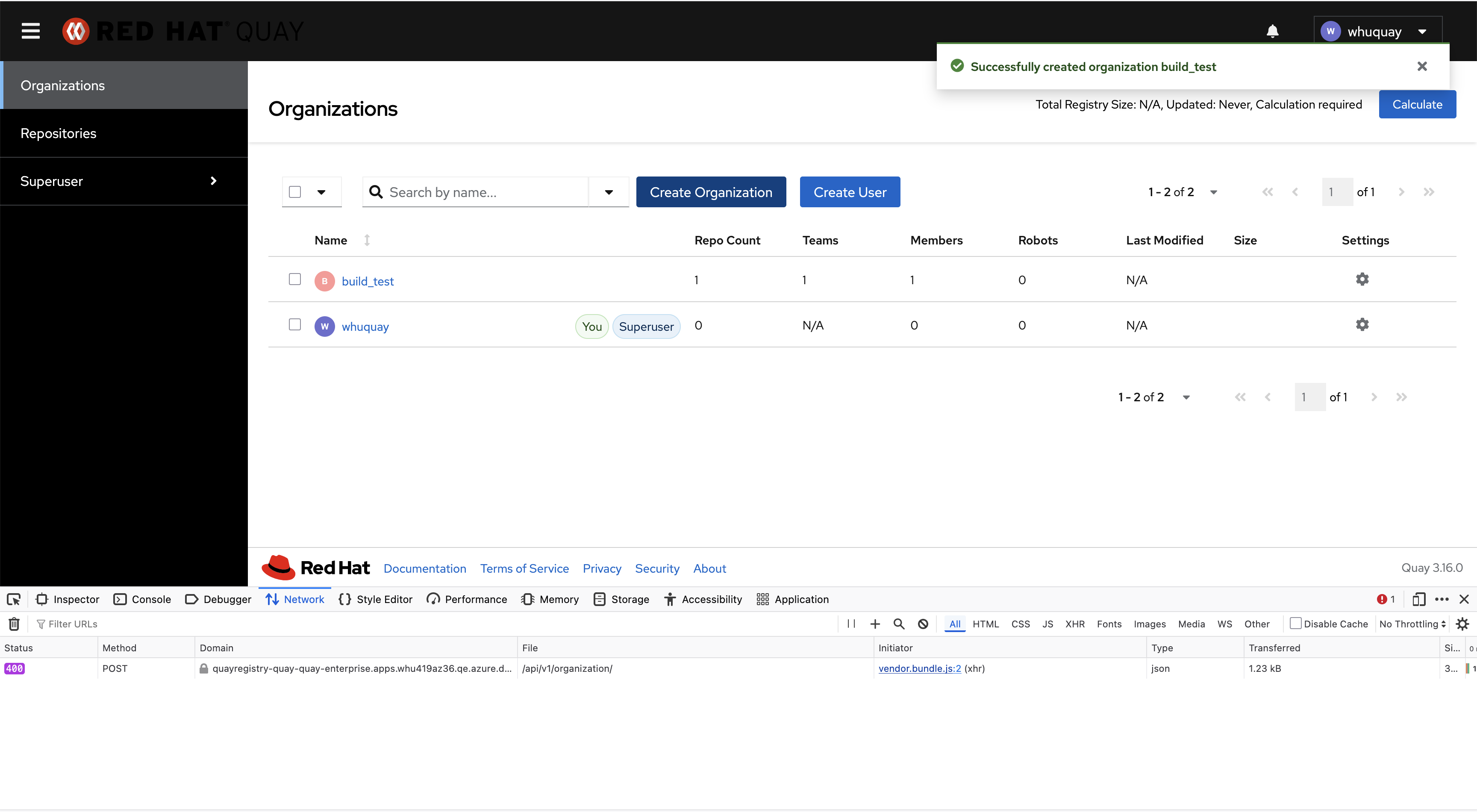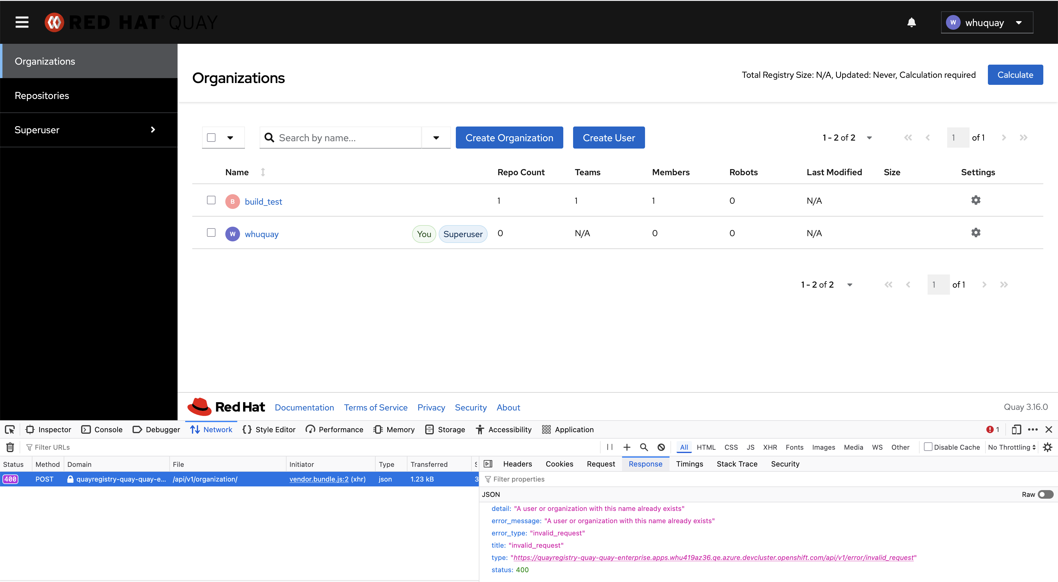 Previously, adding the same organization repeatedly would trigger an error alert 'A user or organization with this name already exists', but this is no longer available in quay 3.16.0.