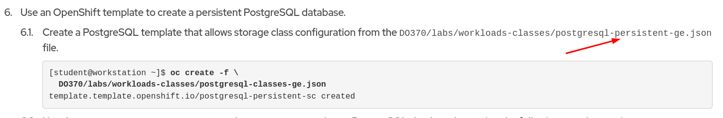 Description: Step 6.1. Create a PostgreSQL template that allows storage class configuration from the DO370/labs/workloads-classes/postgresql-persistent-ge.json file. There is a mistake in the file name, it should be: DO370/labs/workloads-classes/postgresql-classes-ge.json
