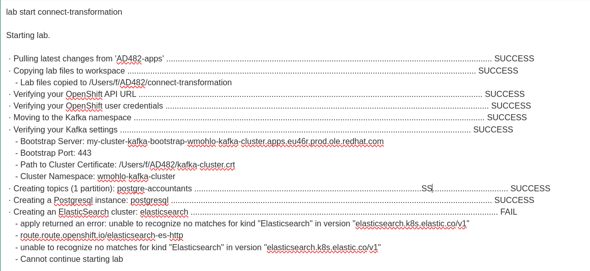It seams that the ElasticSearch operator is not installed on the remote OpenShift cluster (BYOD or cloud workstation lab):