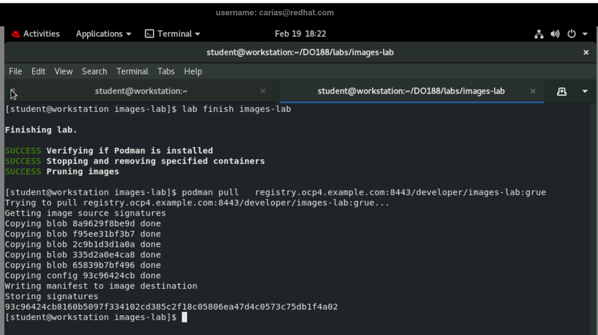 I'have noticed that neither the start or finish lab script for images-lab delete the images located in the registry. in my opinion that would be useful when students want to re-execute the lab in a clean environment. so I suggest you to include registry images deletion for registry.ocp4.example.com:8443/developer/images-lab:latest registry.ocp4.example.com:8443/developer/images-lab:grue