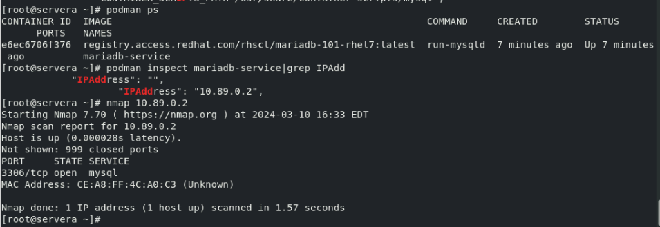 So the exercise in itself won't show up any errors unless the user deliberately tries to access the container database without exposing the port to the host. It's possible to access the database by pointing directly to 10.89.0.2:3306.