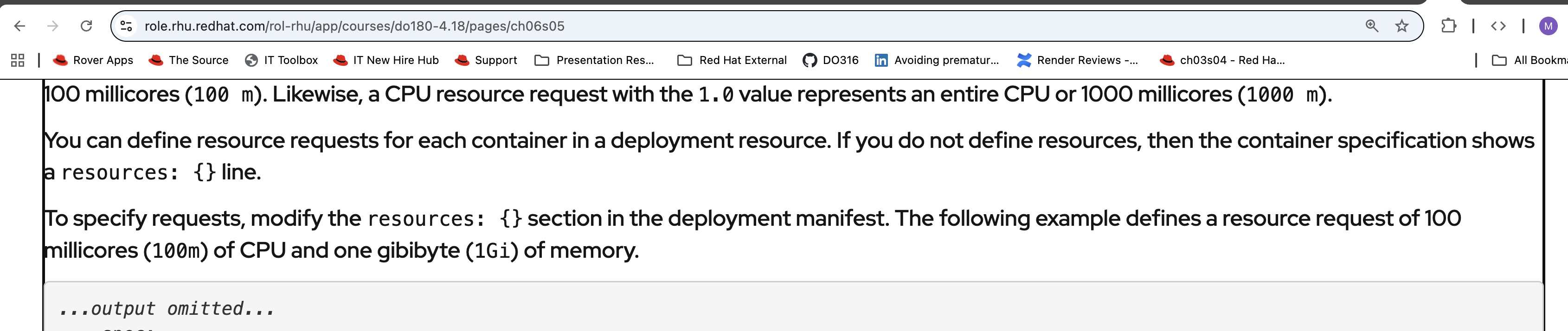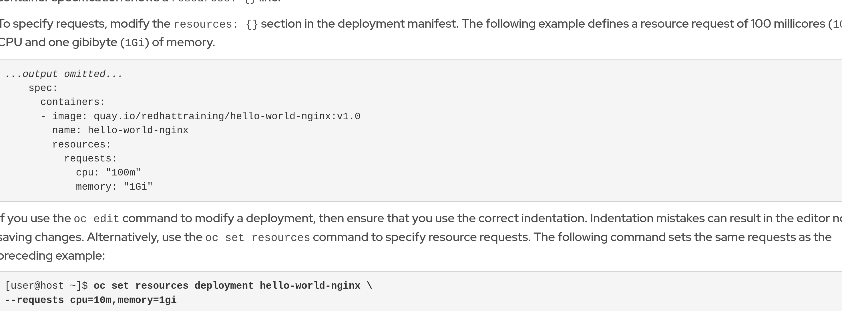 Text says "In your deployment, modify the resources: {} line to specify the chosen requests. The following example defines a resource request of 100 millicores (100 m) of CPU and one gigabyte (1 Gi) of memory."