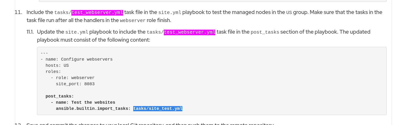 Where in the exercise says "test_webserver.yml" it should say "site_test.yml" in order to match the files deployed by the git repository