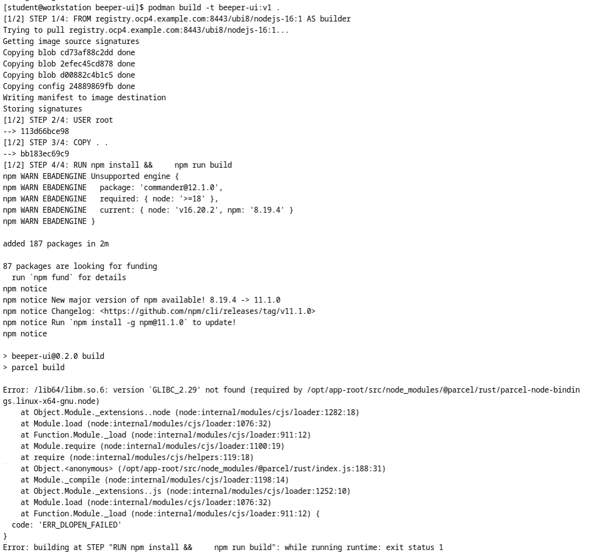 Error: /lib64/libm.so.6: version `GLIBC_2.29' not found (required by /opt/app-root/src/node_modules/@parcel/rust/parcel-node-bindings.linux-x64-gnu.node)