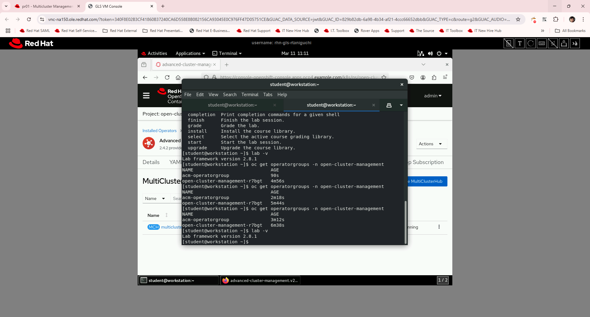 Navigating the RHACM Web Console). The lab start hangs indefinitely.