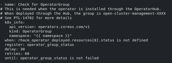 Among these checks, it looks for an operator group named acm-operatorgroup on the hub cluster in the open-cluster-management project.