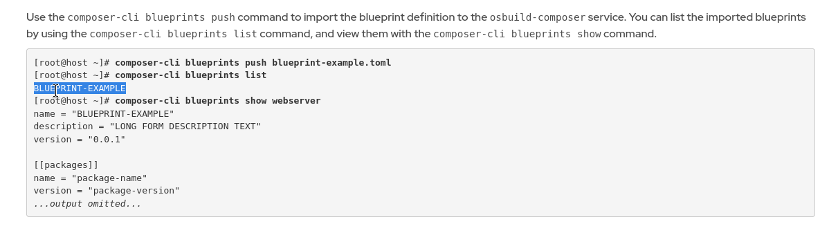 "root@host ~]# composer-cli blueprints push blueprint-example.toml