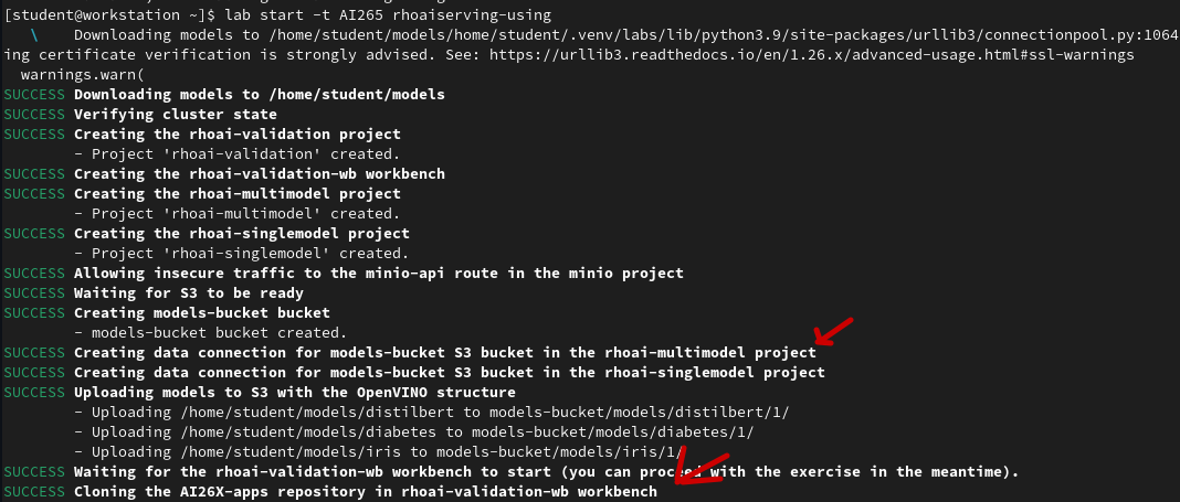 Also in step 8 in the rhoai-validation project in the workbench "rhoai-validation-wb" the jupyter notebook is opened but the RH AI26X-apps github repo is missing. I had to clone it myself and then had to switch to branch "RHOAI2.13" in order to find and start the notebook "validate_model_servers.ipynb".