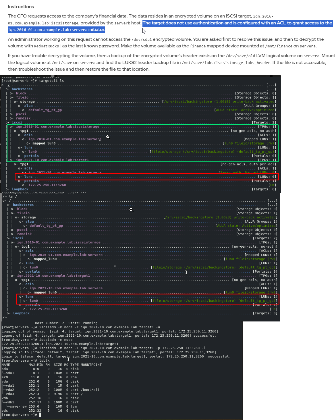 "The target does not use authentication and is configured with an ACL to grant access to the iqn.2016-01.com.example.lab:servera initiator."