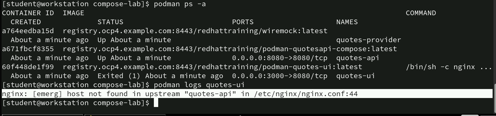 The compose.yaml file networking is incorrect, as in step 4, we are asked to isolate the container quotes-ui from the quotes-provider and quotes-api.