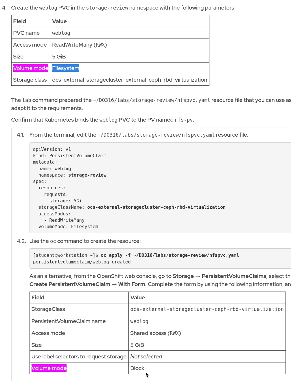 DO316: ch05s07 - incorrect volume mode in description table - RHT2390479