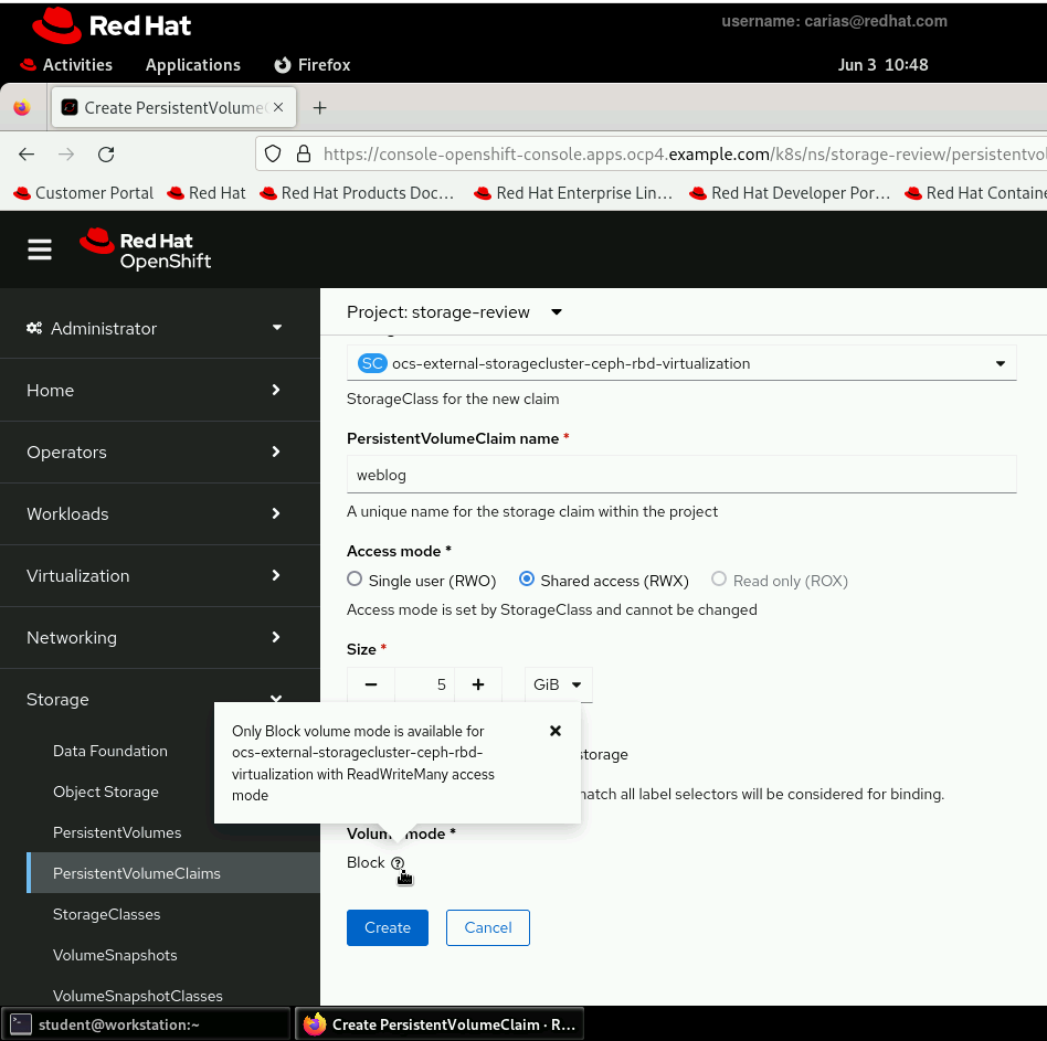 Step 4,  it's not possible to select RWX and filesystem at the same time for the rbd-virt storageclass. The table in the solution has the correct volume mode set to Block.