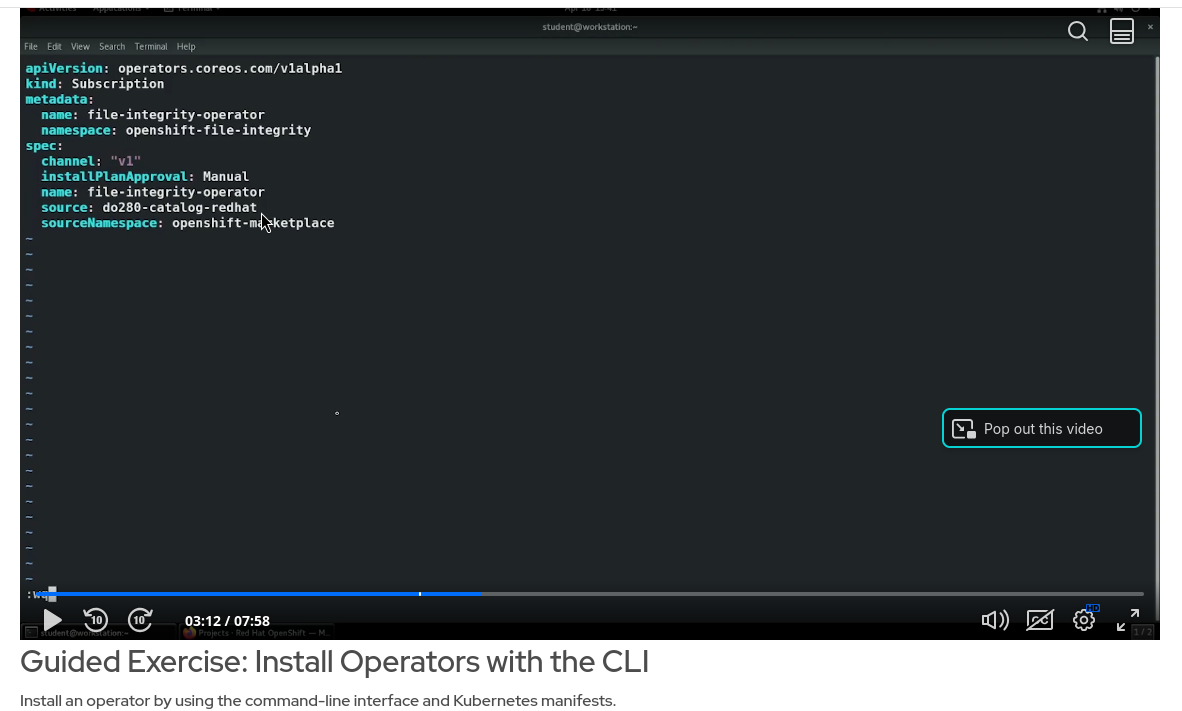 In the guided excercise: install operators with the CLI I found that in the video at 3:10, the source which is referred to in the subscription.yaml is 'do280-catalog-redhat', where it should be 'do280-catalog-cs', which is present in the openshift-marketplace namespace and is also referred to in the PackageManifest of the file-integrity-operator. I've added some screenshots.