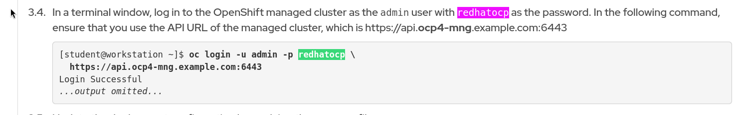 It lists the credentials as admin|rhocp but they are correctly listed in the lab guide as admin|redhatocp