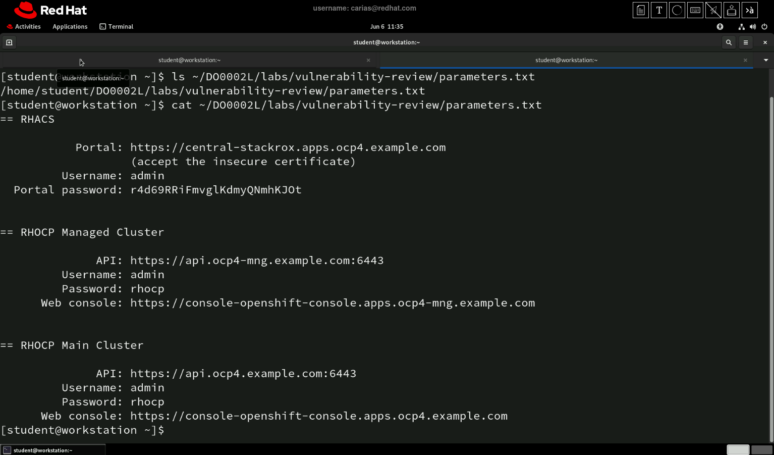 Change 'admin|rhocp' to 'admin|redhatocp' in the ~/DO0002L/labs/vulnerability-review/parameters.txt file.