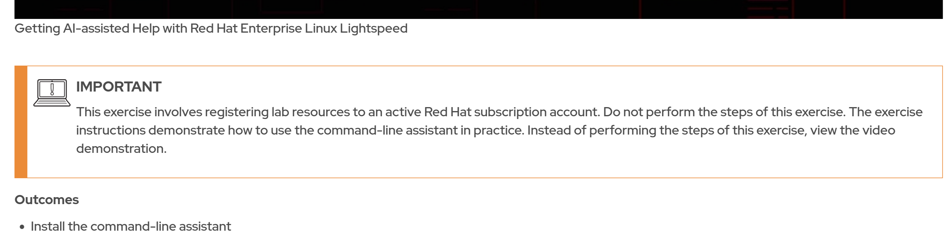 Section Title: | h2. Guided Exercise: Ask Questions and Evaluate Answers from the Command-line Assistant |