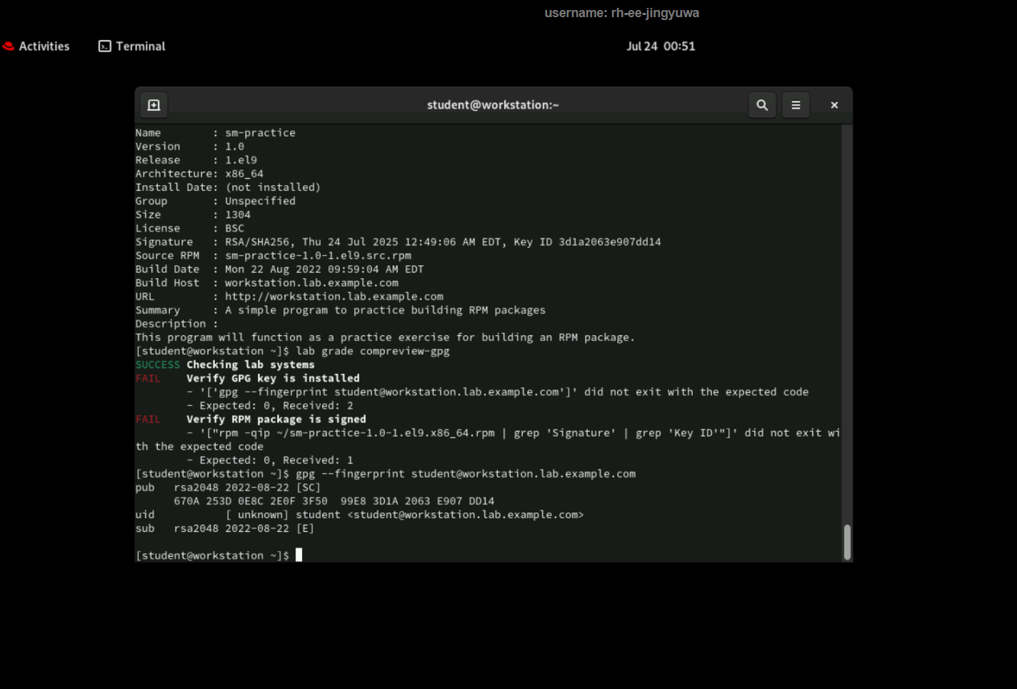 Student reported that even strictly followed the instruction of the lab still he is not able to pass the lab grade script. The lab grade script will always return "fail" for "Verify GPG key is installed" and "Verify RPM package is signed".