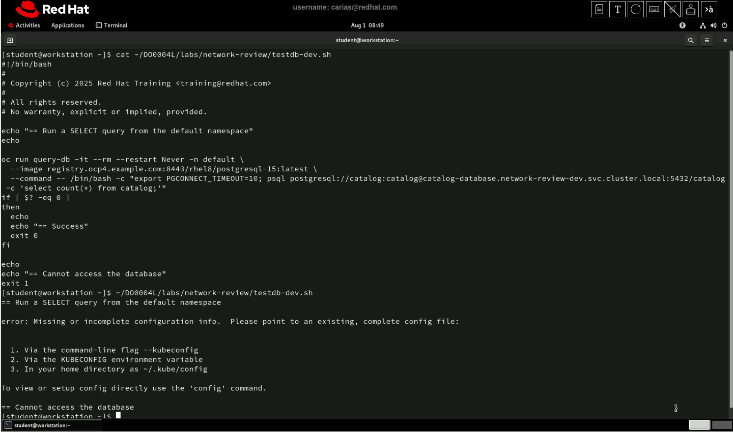 AT STEP 2, The script ~/DO0004L/labs/network-review/testdb-dev.sh assumes that you're connected to the managed cluster which may not be the case. The script should either check that you're connected to the right cluster, or even better, connect to the managed cluster by using a temporary kubeconfig.
