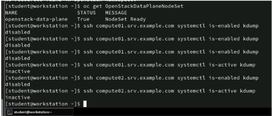 Step 6 checks to see if kdump is enabled and active on compute01 and compute02