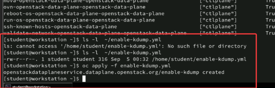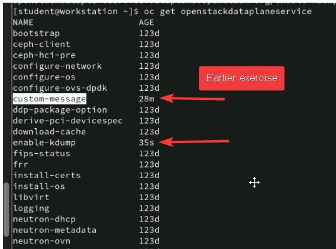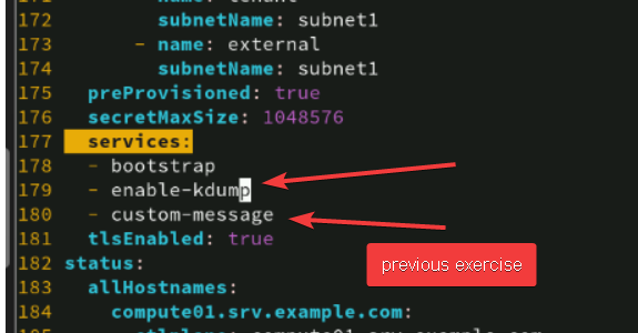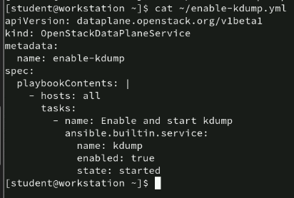 The service 'custom message' from the previous exercise cl170-18.0 / ch10s02 is still present during this one - as seen when executing step 3.3 , consequently , step 4.3 where osdpns.yml file is to be edited to include 'enable-kdump' - the 'custom message' entry can also be seen. It is not clear from the instructions if this is intentional , or there has been no cleanup after the previous exercise.