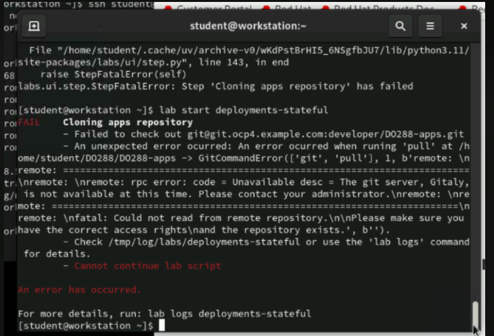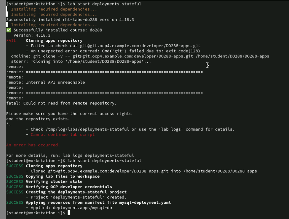 While running the "lab start deployments-stateful" script, it is hanging on "Cloning apps repository" for few learners.
