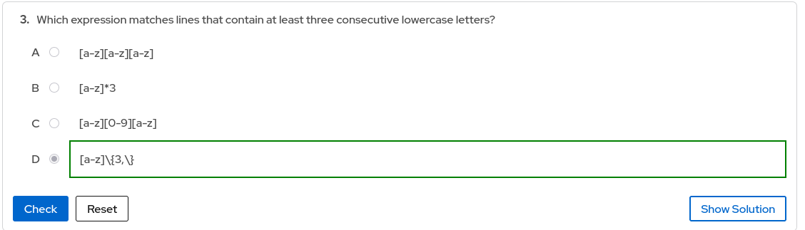 Question 3: BOTH A and D are correct. A will not highlight all the characters, but it WILL match the lines.