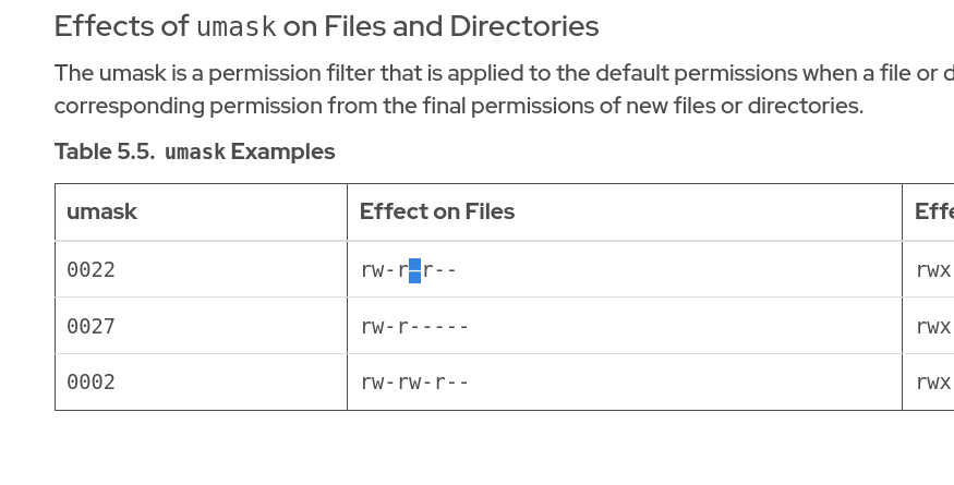 rh0020l-10.0 + missing a dash in Table 5.5, umask 0022 effect on files: