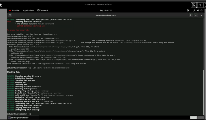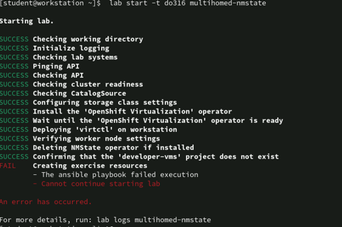 Instructor reported that the lab start command was failed at the first time, When I tried once again, The lab command was successful. Confirmed with Platform team, Rudi says this is a content issue . Please check