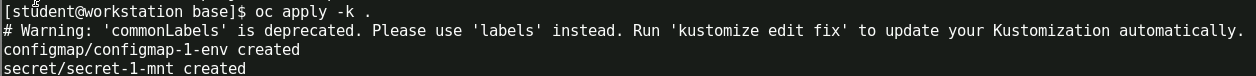 If commonLabels has been deprecated we should not be using it. If there is a different syntax that we should be using then need to clarify what it is so that we can recommend to the student the correct recommended way of doing it. If this is a problem related to the difference between 'kustomize' and the oc -k option then maybe we just need to remove all mention of it from the guide