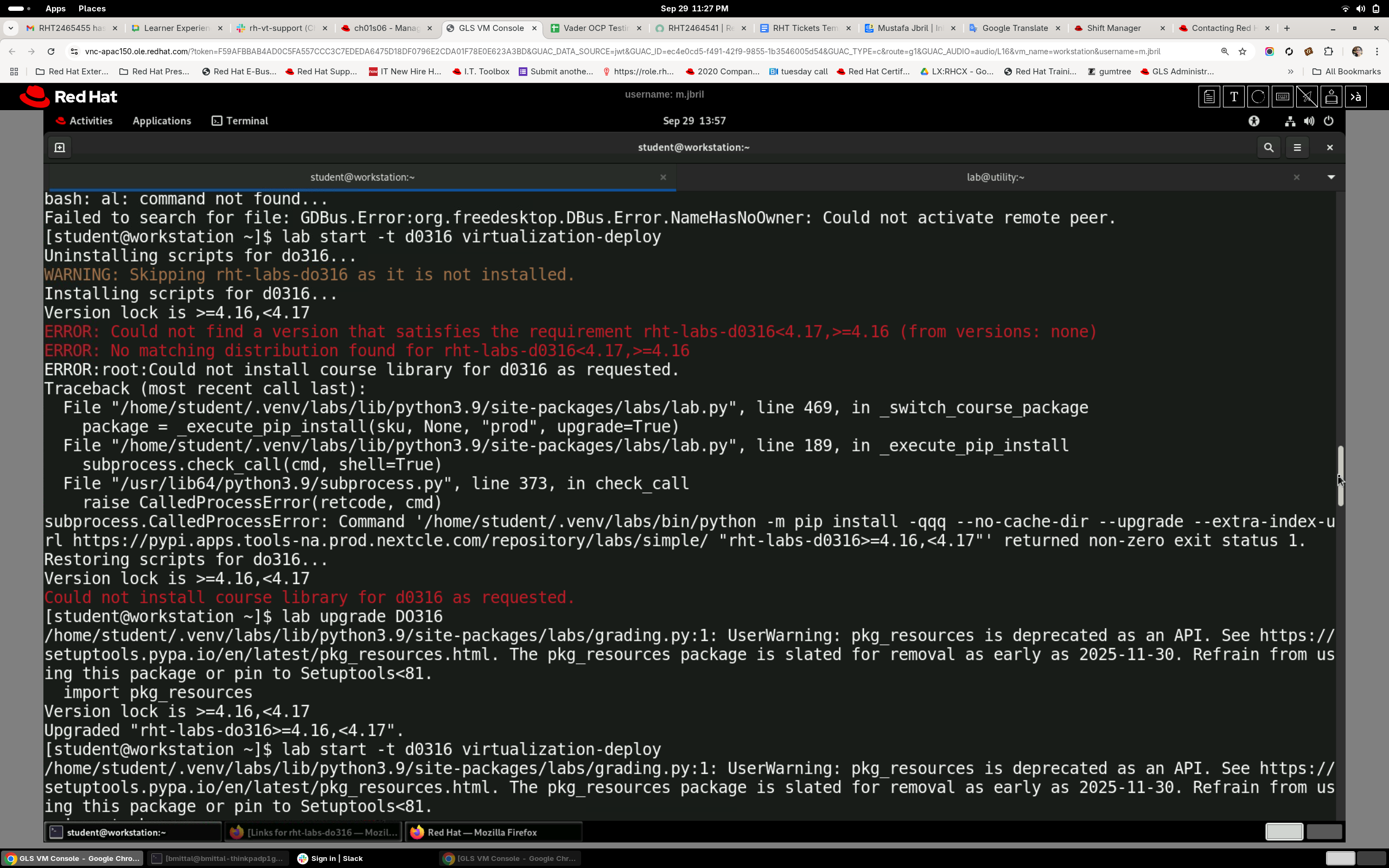 Learner faced this issue previously and after ab rebuild it started working. Learner isn't ready to rebuild the lab again.