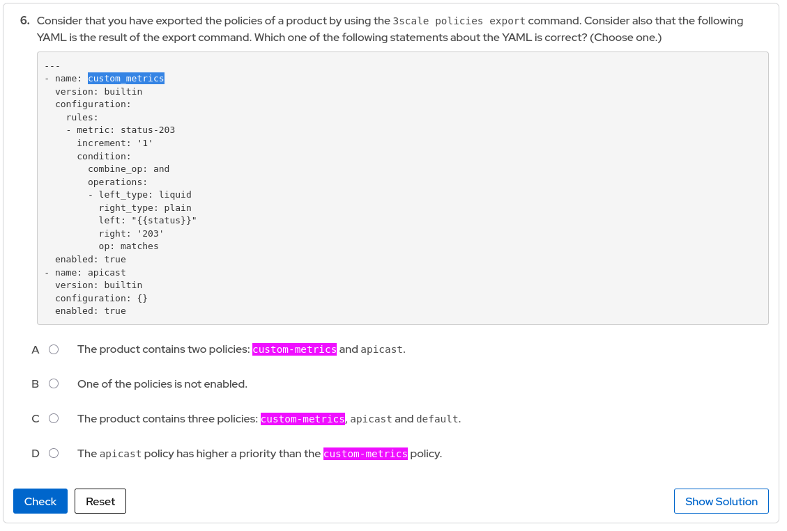 The question 6 in "Quiz: Managing and Customizing API Gateways" the metric name it's "custom_metrics", not custom-metrics as writed in option A, C and D.