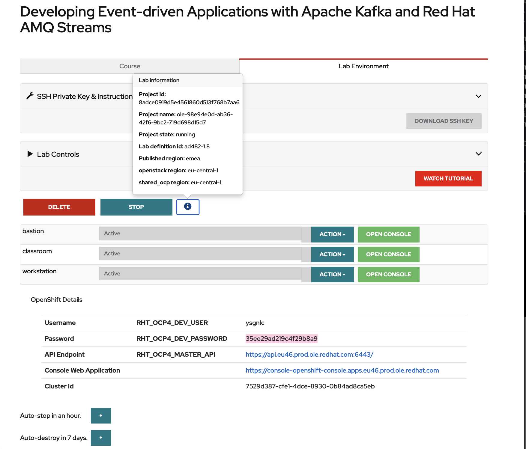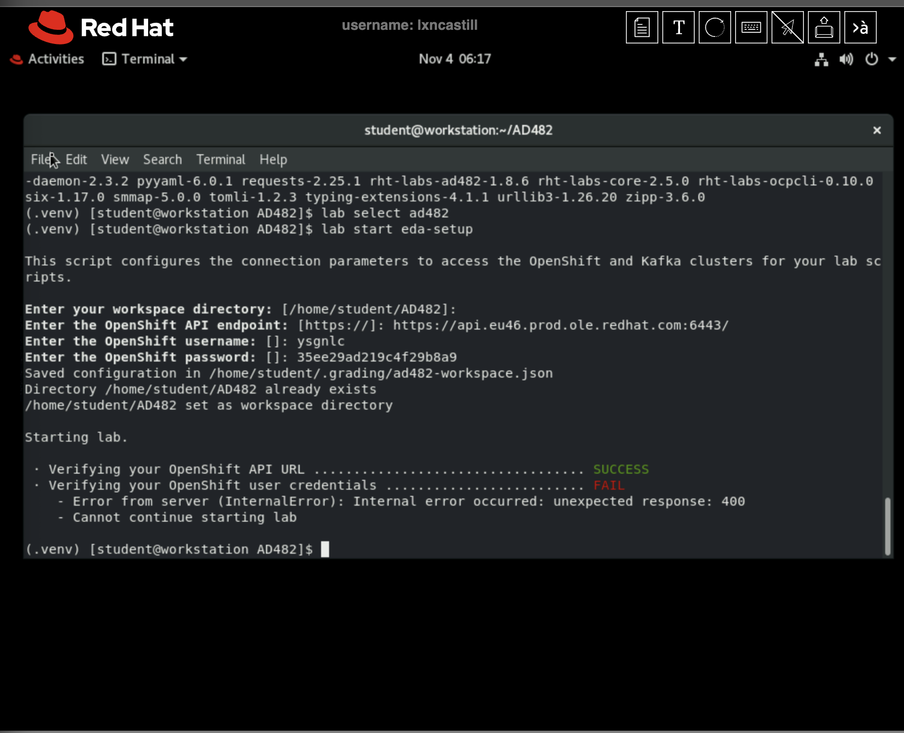 When running 5.6 (lab start eda-setup) which verifies the OSP details it fails with and InternalError (see attached screenshots).