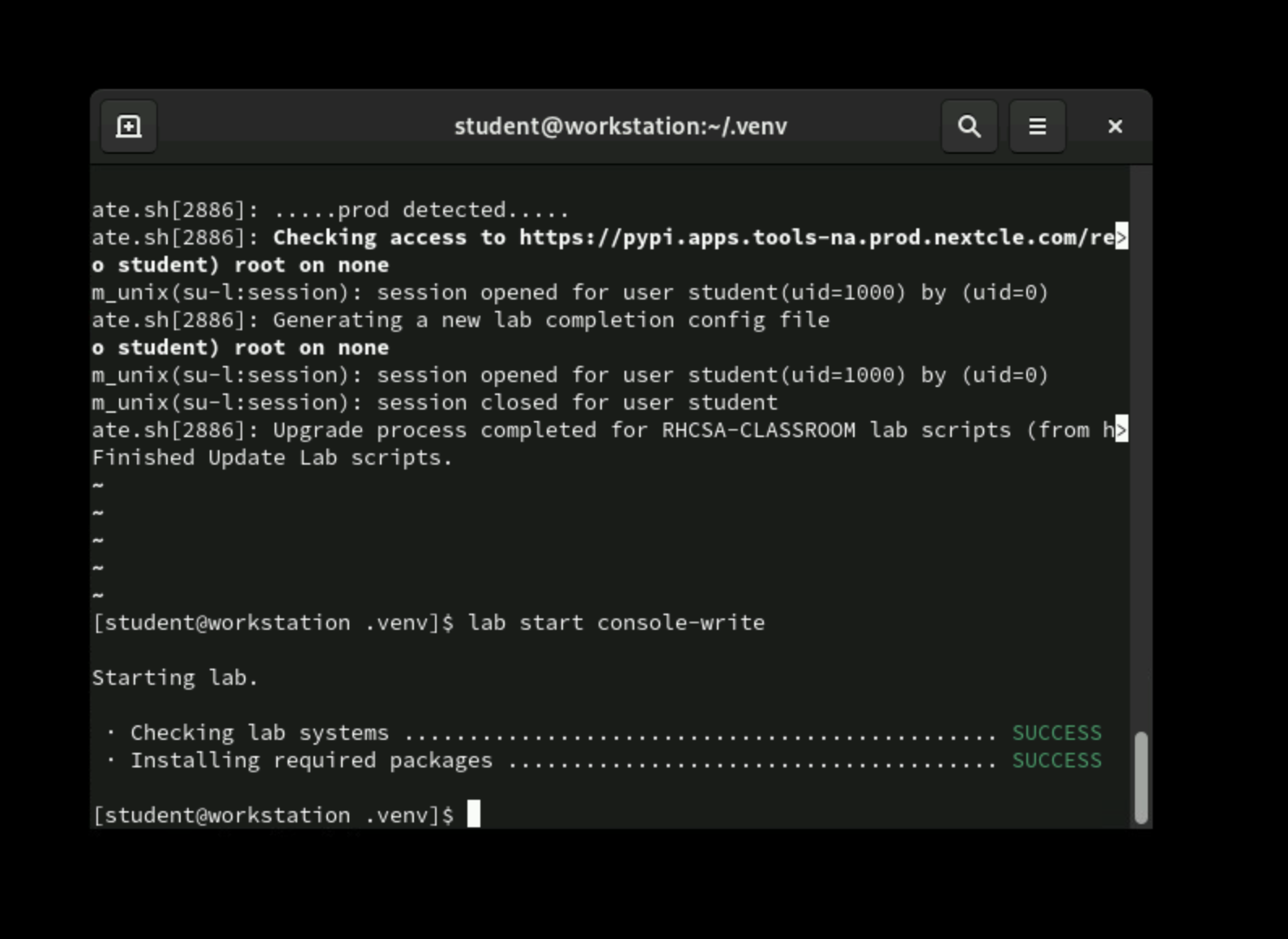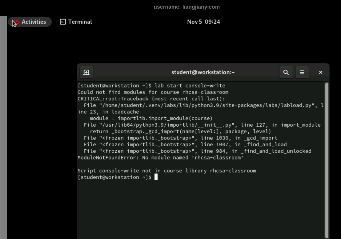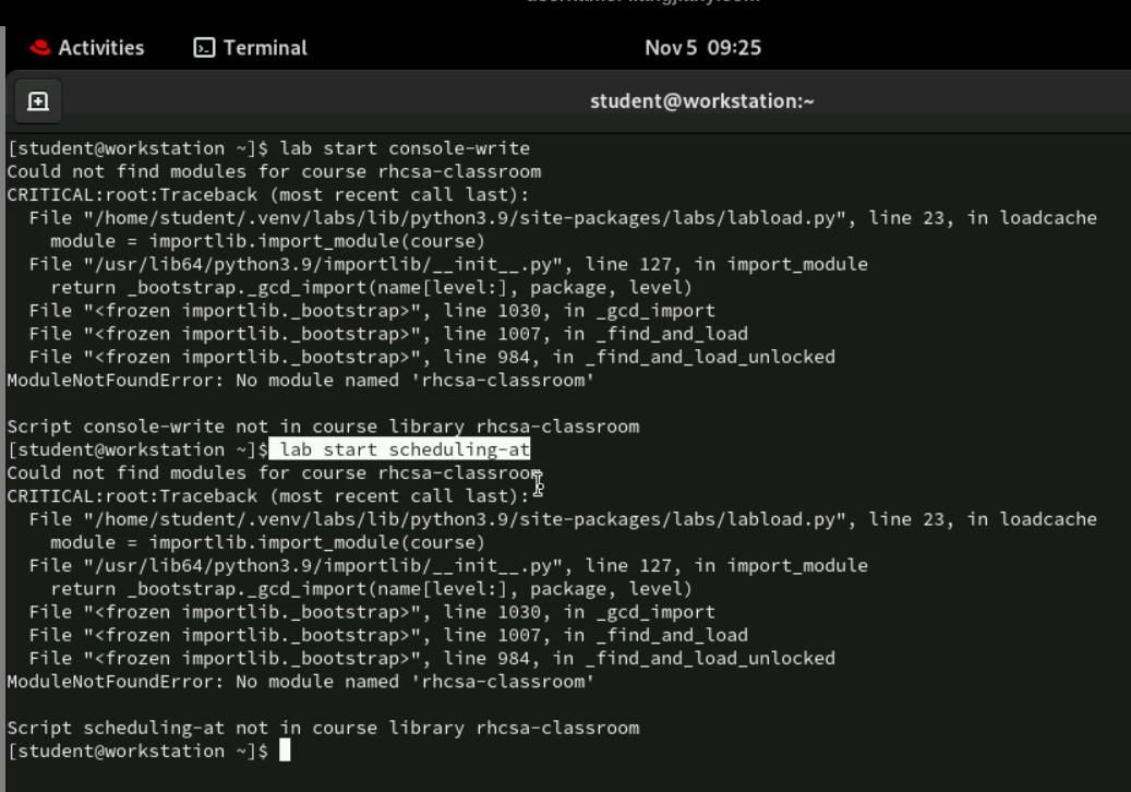 Lab start scripts are failing for all the Guided exercises with error rhcsa-classroom module not found.