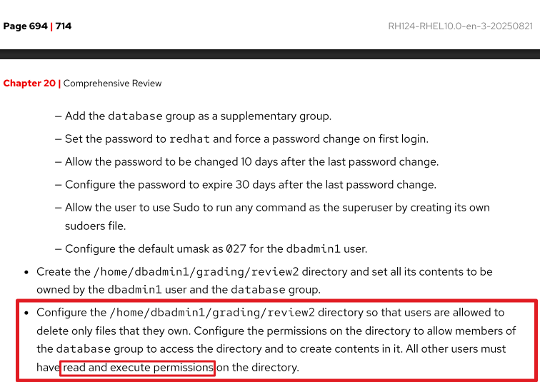 But when configuring those permissions the 'lab grade rhcsa-rh124-review2' command gives a failed grade for that task and only grants a pass mark when only 'read' privileges are configured to /home/dbadmin1/grading/review2 directory (as seen in solution "screenshot 2").