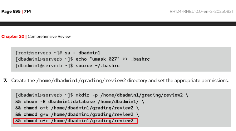 In the "rhcsa-rh124-review2" the task asks to give "read and execute privileges" to "other" users on directory "/home/dbadmin1/grading/review2" (as seen in screenshot 1).