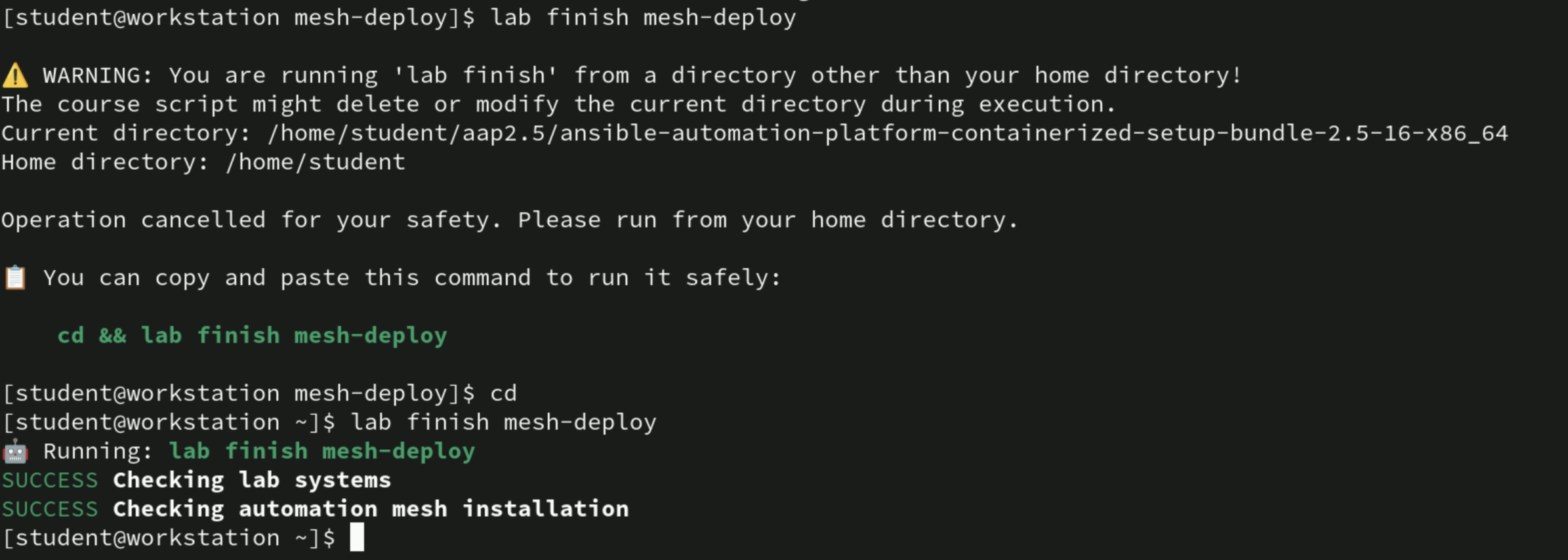 In every Guided exercise in the end, no command is given to change directory to home directory because of which lab finish command fails and we need to manually do cd and then lab finish command. Please check screenshot for reference